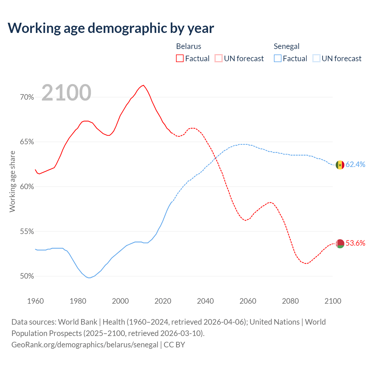 - Belarus has 5.95M working age adults (aged 15-64) vs 11.3M in Senegal.