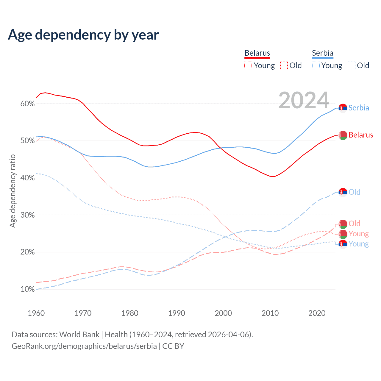 - Belarus is ranked 35/196 by median age (oldest to youngest) vs 15/196 for Serbia.