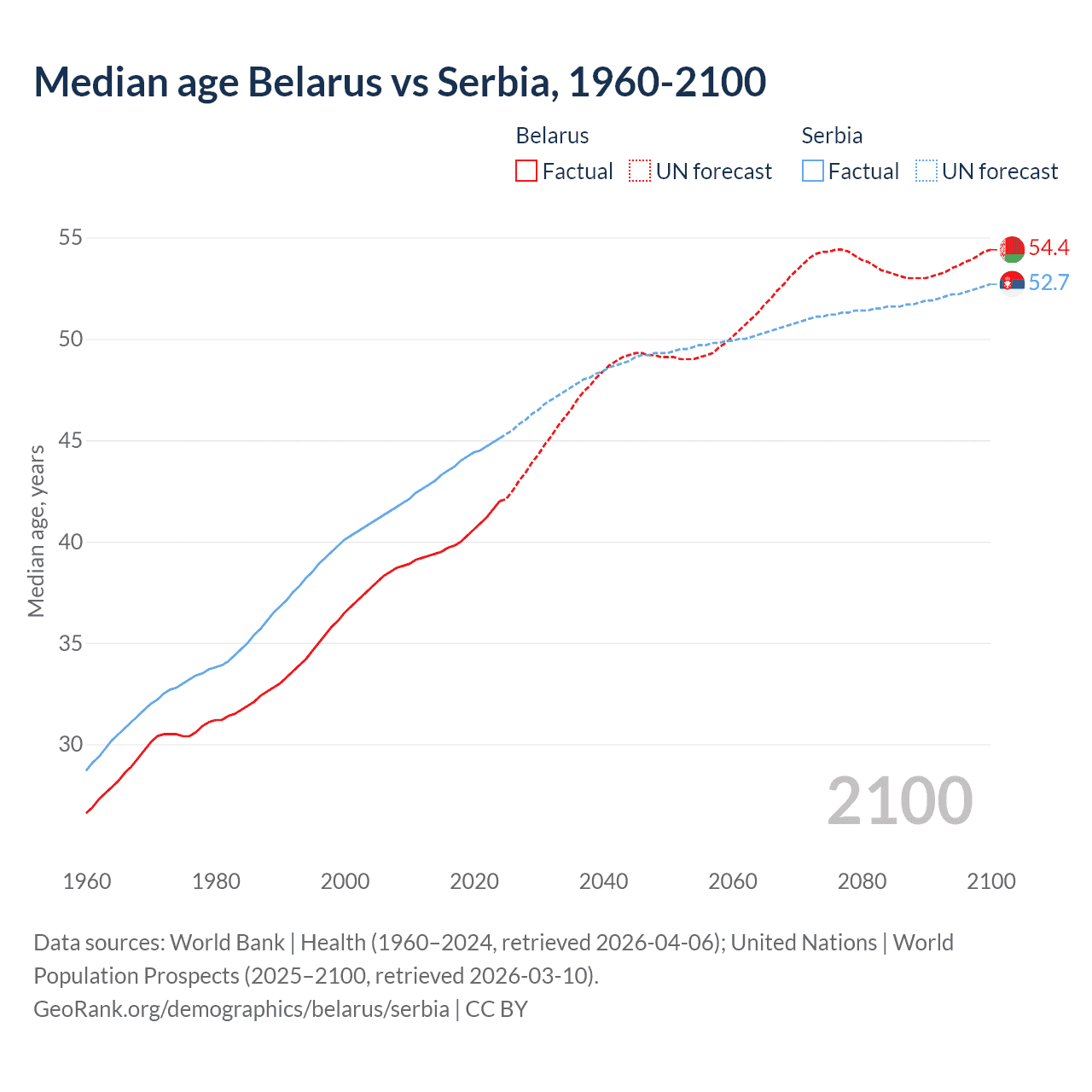 Median age Belarus vs Serbia, 1960-2100