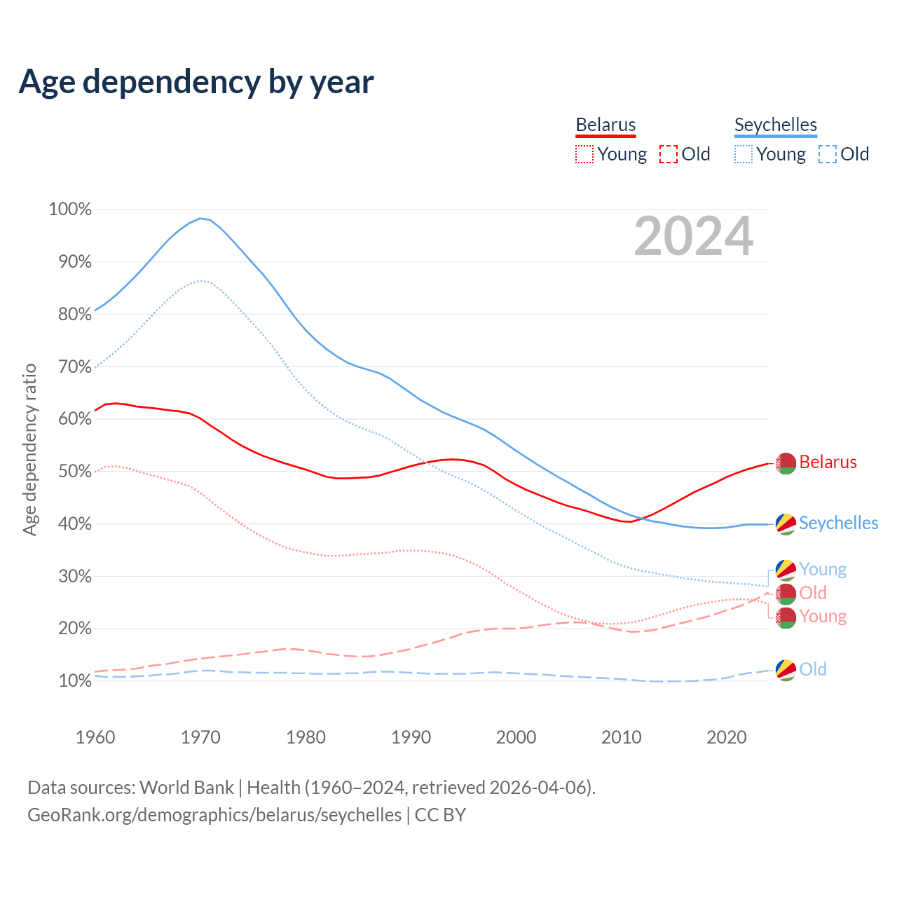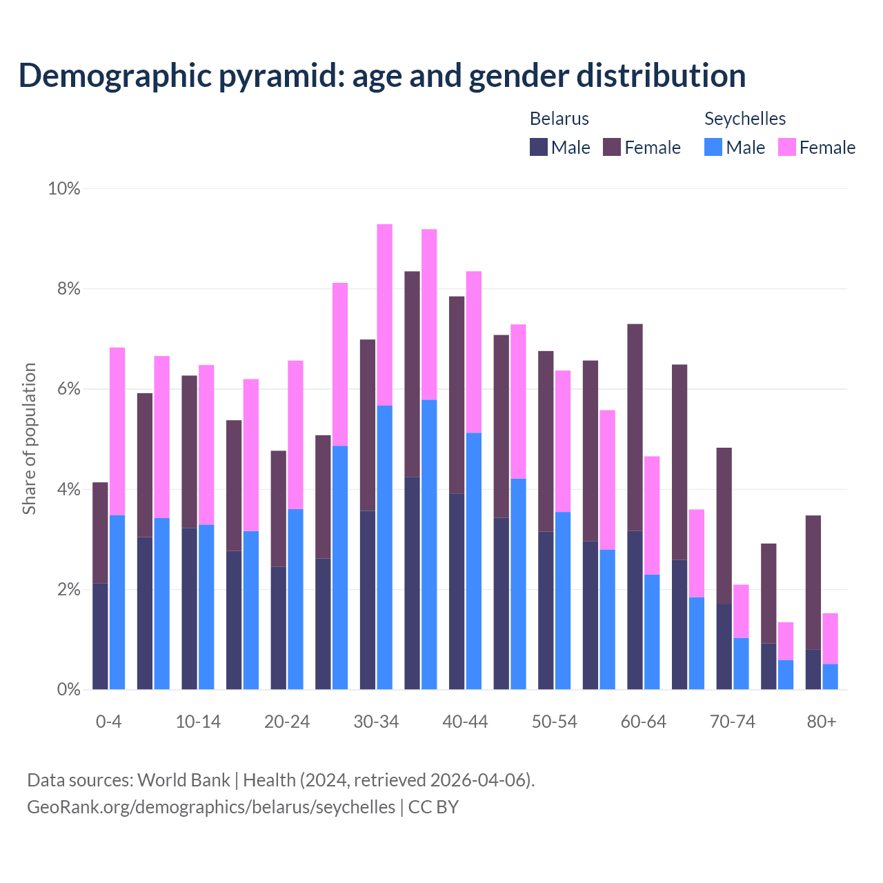 - Belarus is ranked 35/196 by median age (oldest to youngest) vs 76/196 for the Seychelles.