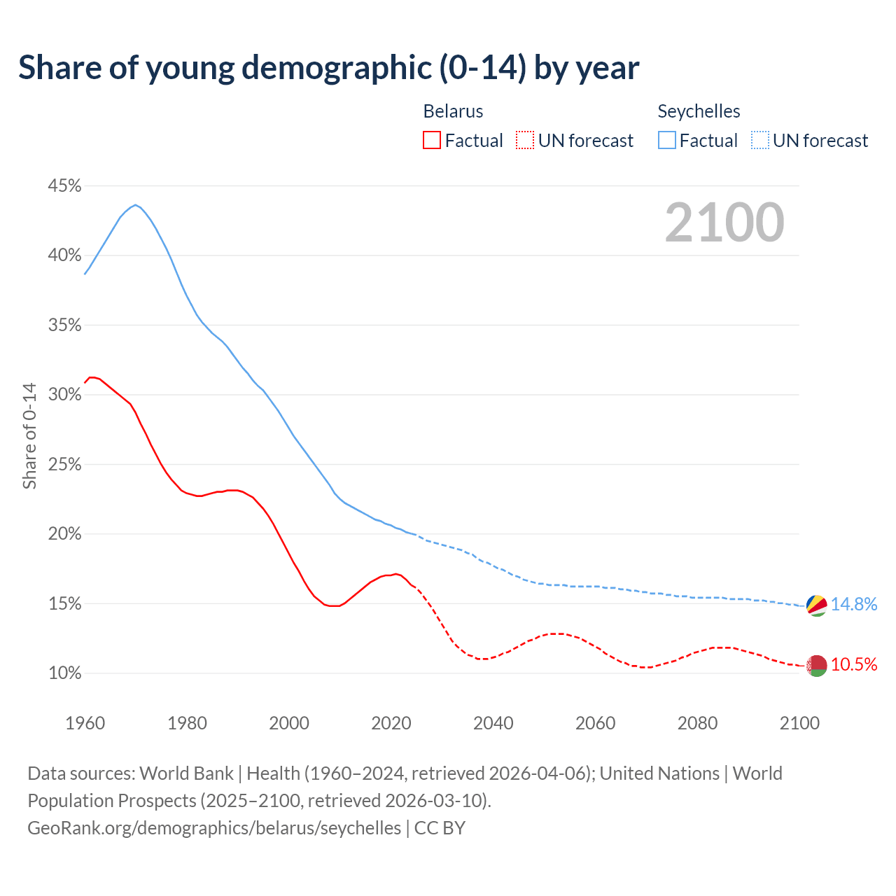 - The share of young demographic (0-15 years old) in Belarus is 16.3% vs 20% in the Seychelles.