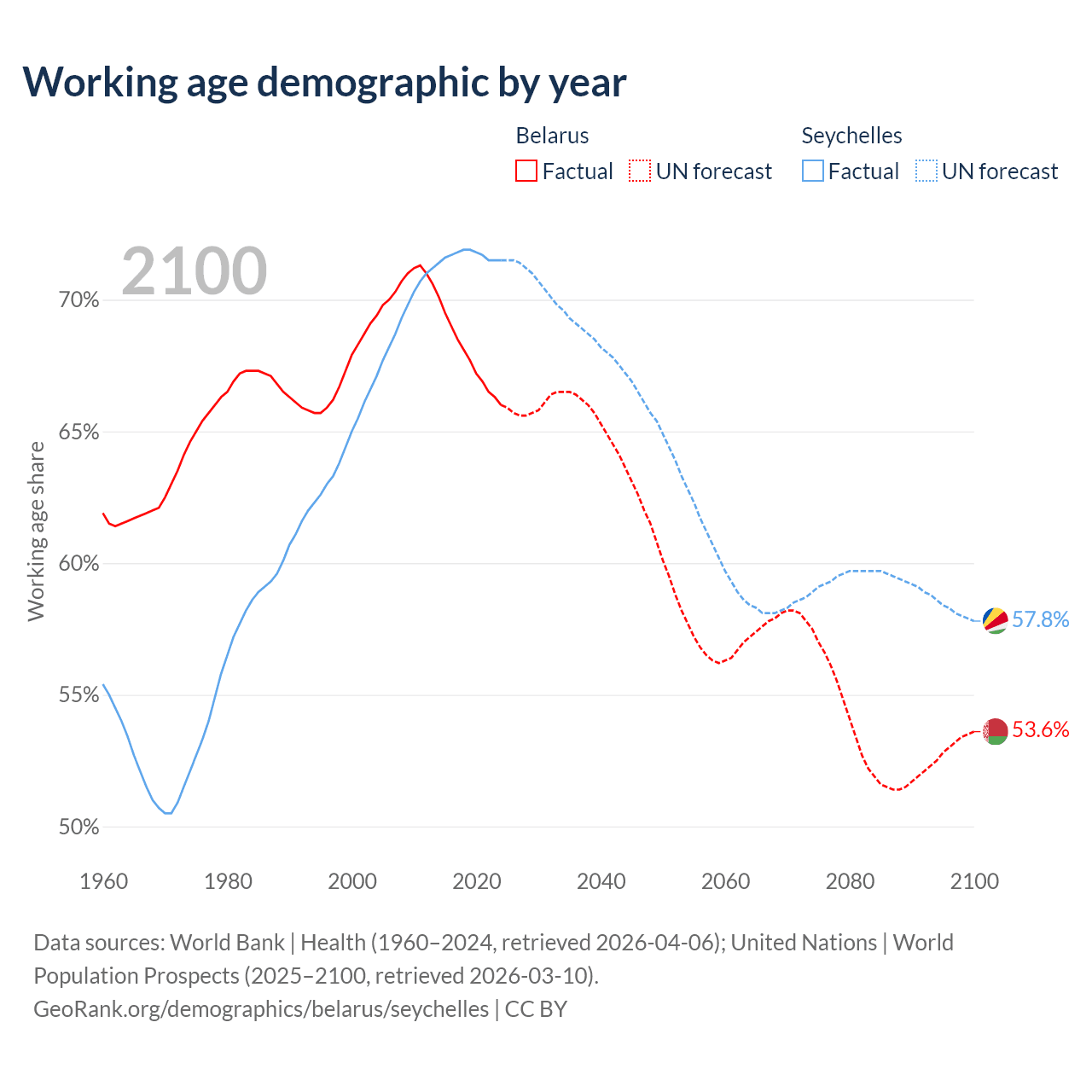 - Belarus has 5.95M working age adults (aged 15-64) vs 90.3K in the Seychelles.