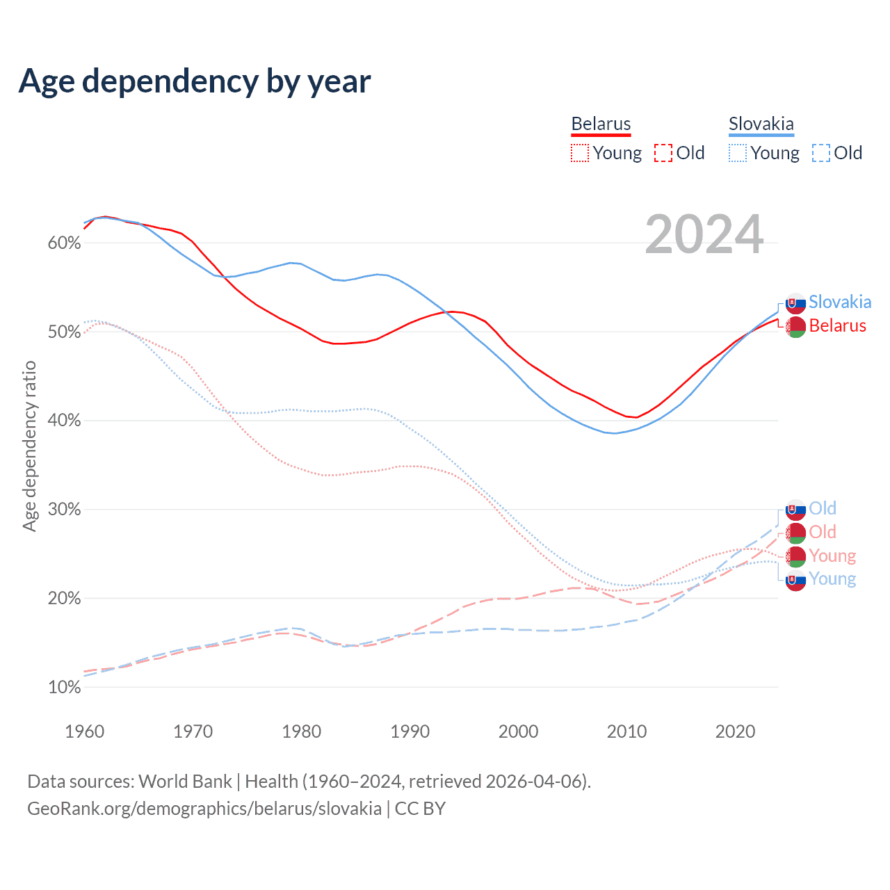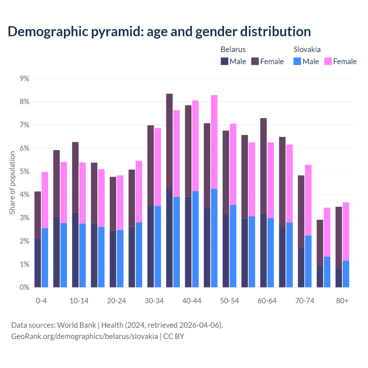- Belarus is ranked 35/196 by median age (oldest to youngest) vs 31/196 for Slovakia.