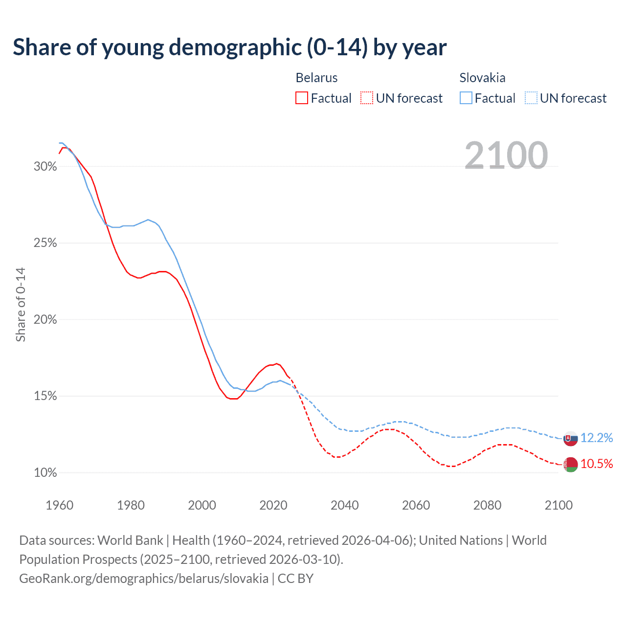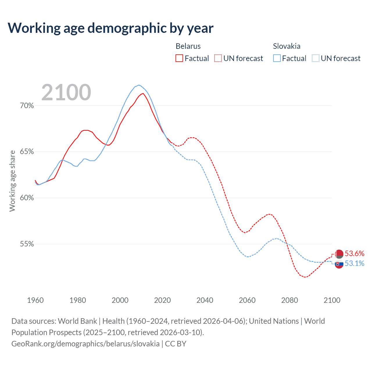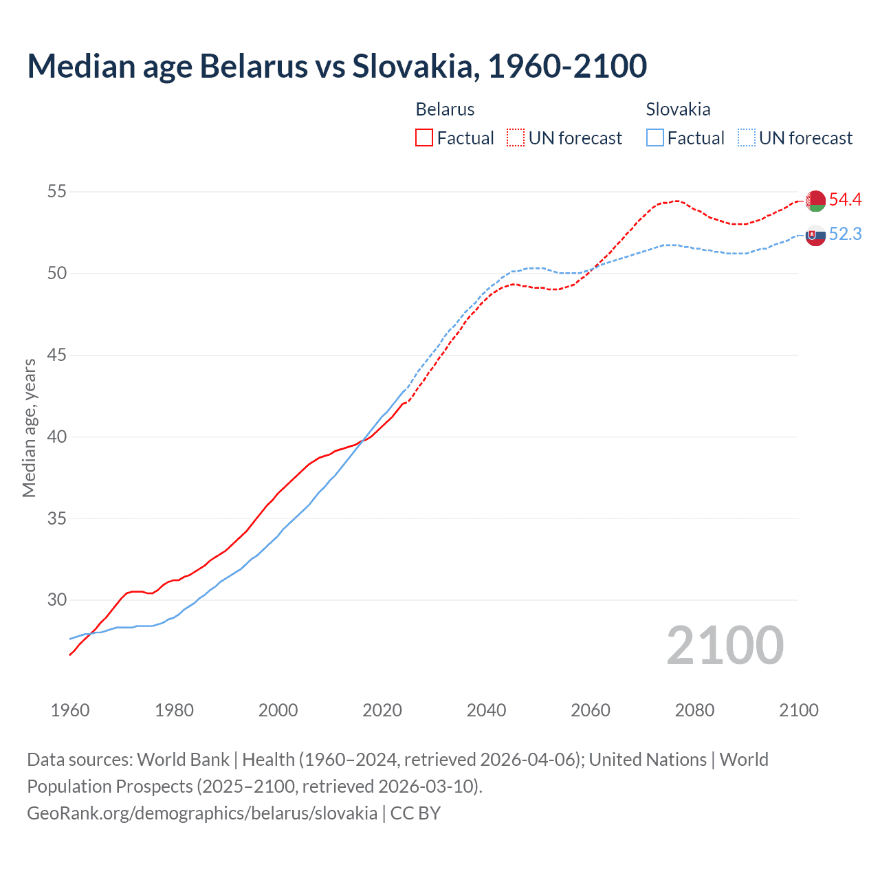 Median age Belarus vs Slovakia, 1960-2100
