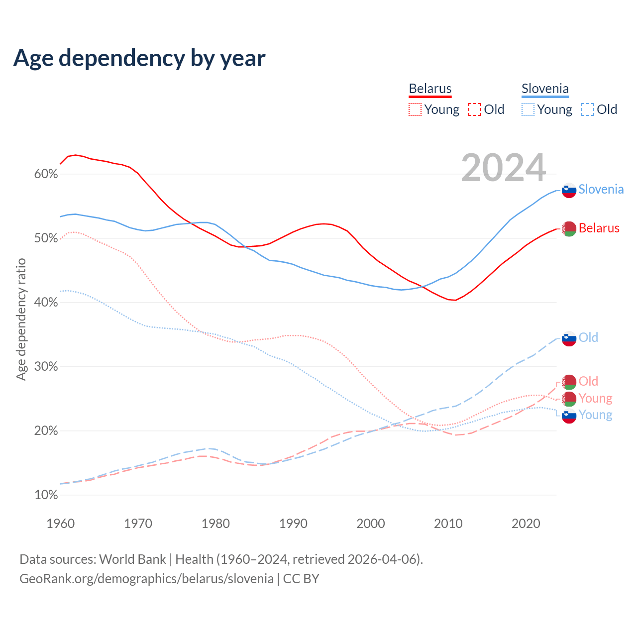 - Belarus is ranked 35/196 by median age (oldest to youngest) vs 14/196 for Slovenia.
