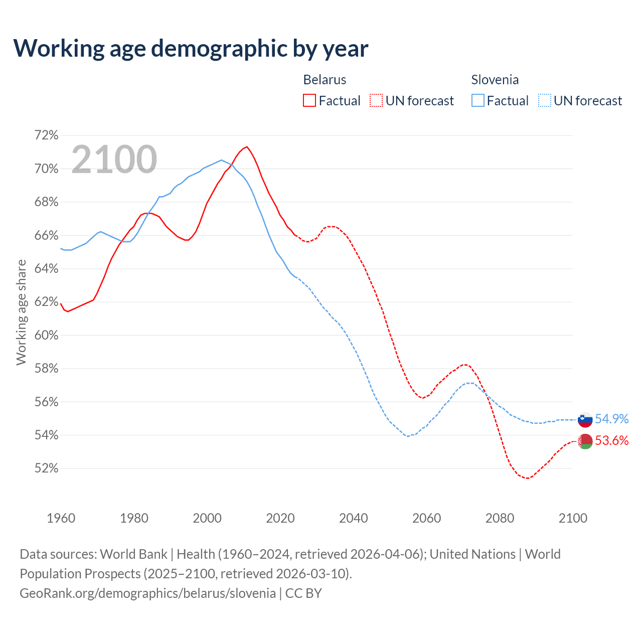 Median age Belarus vs Slovenia, 1960-2100