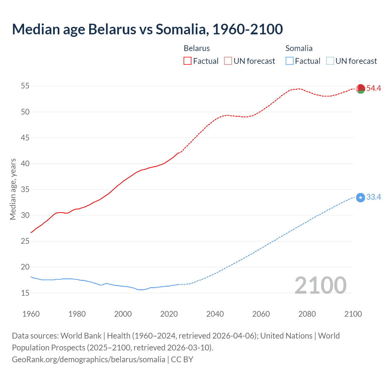 Median age Belarus vs Somalia, 1960-2100