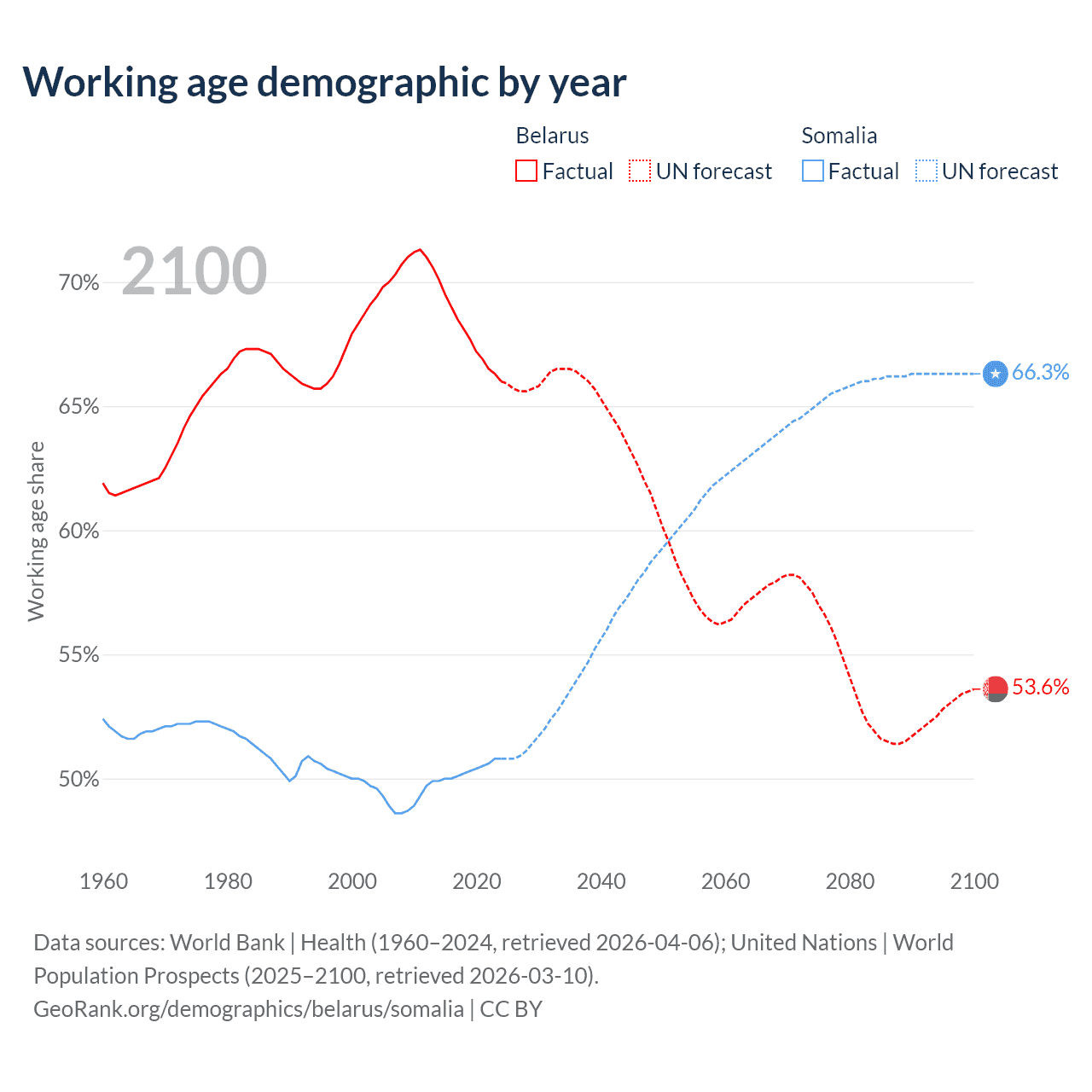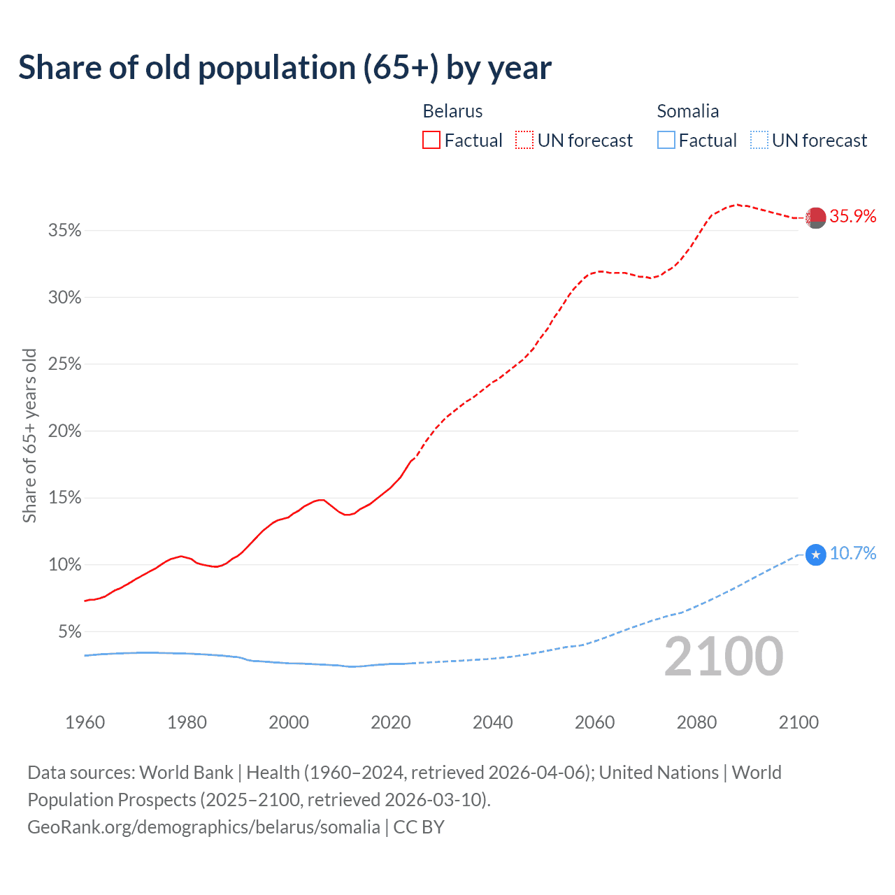 - The share of old-age demographic (65+) in Belarus is 17.7% vs 2.59% in Somalia.