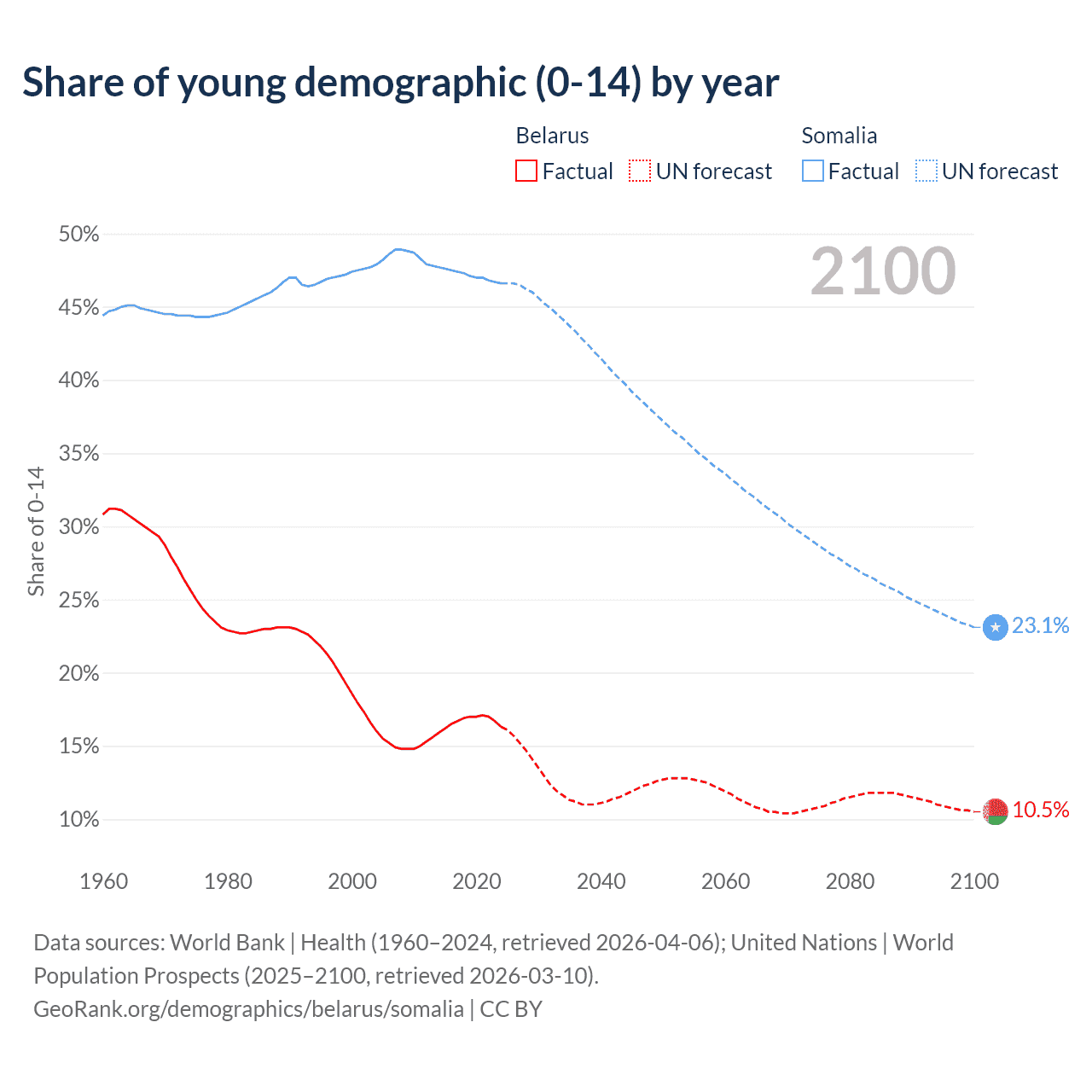 - The share of young demographic (0-15 years old) in Belarus is 16.3% vs 46.6% in Somalia.