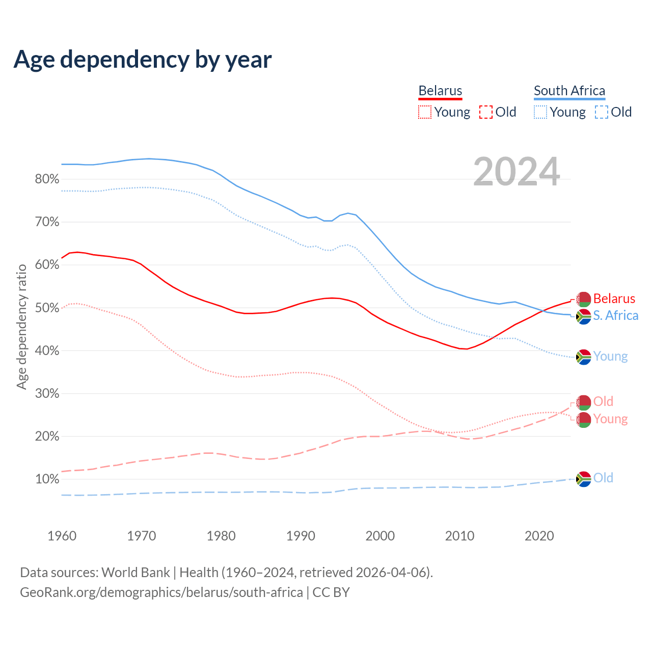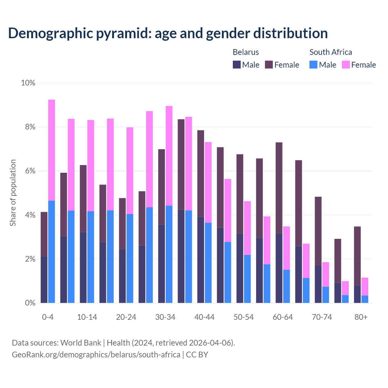 - Belarus is ranked 35/196 by median age (oldest to youngest) vs 107/196 for South Africa.