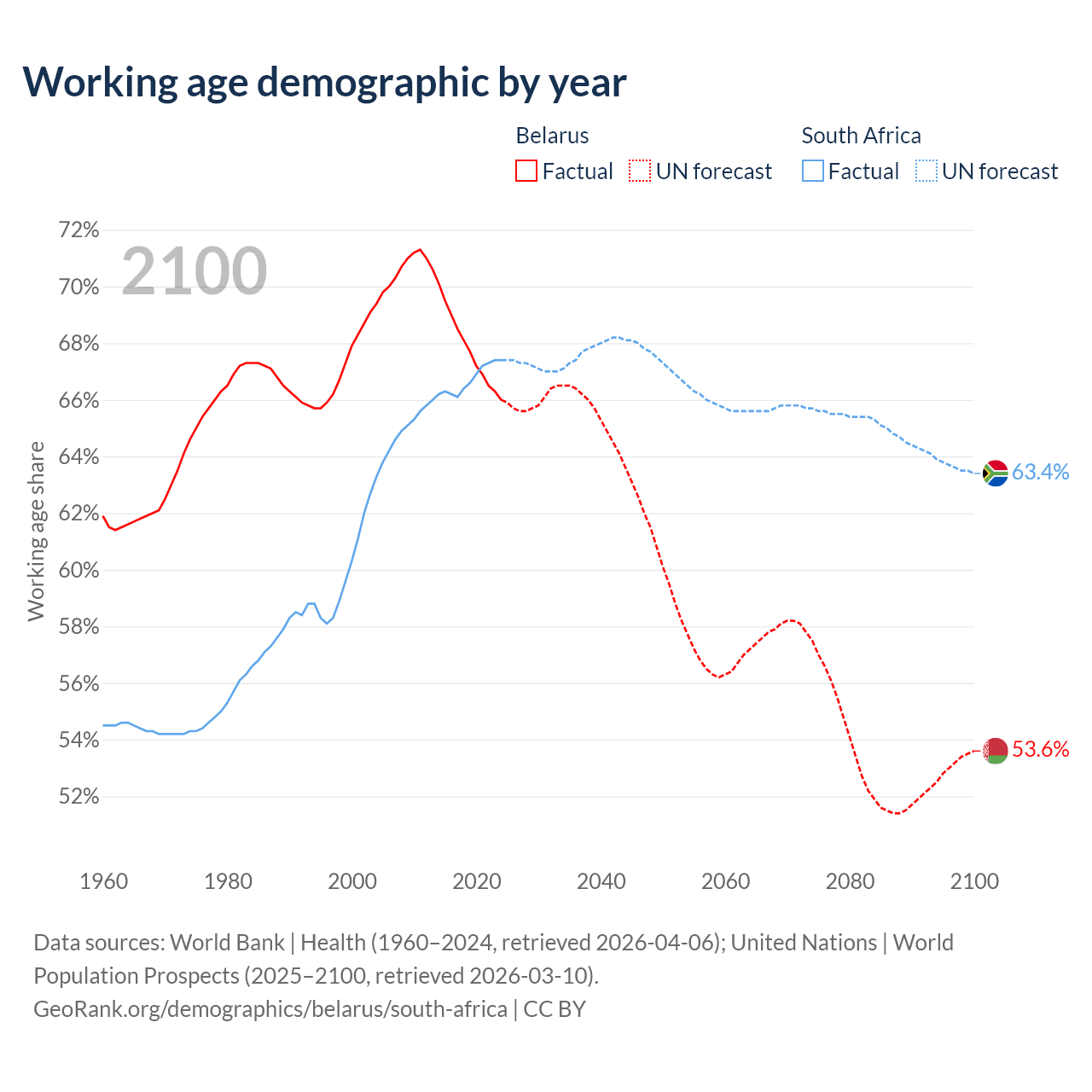 Median age Belarus vs South Africa, 1960-2100