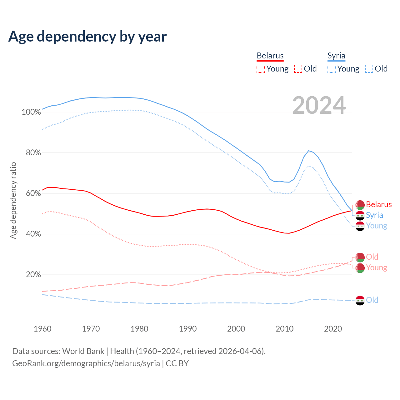 - The share of old-age demographic (65+) in Belarus is 17.7% vs 4.74% in Syria.