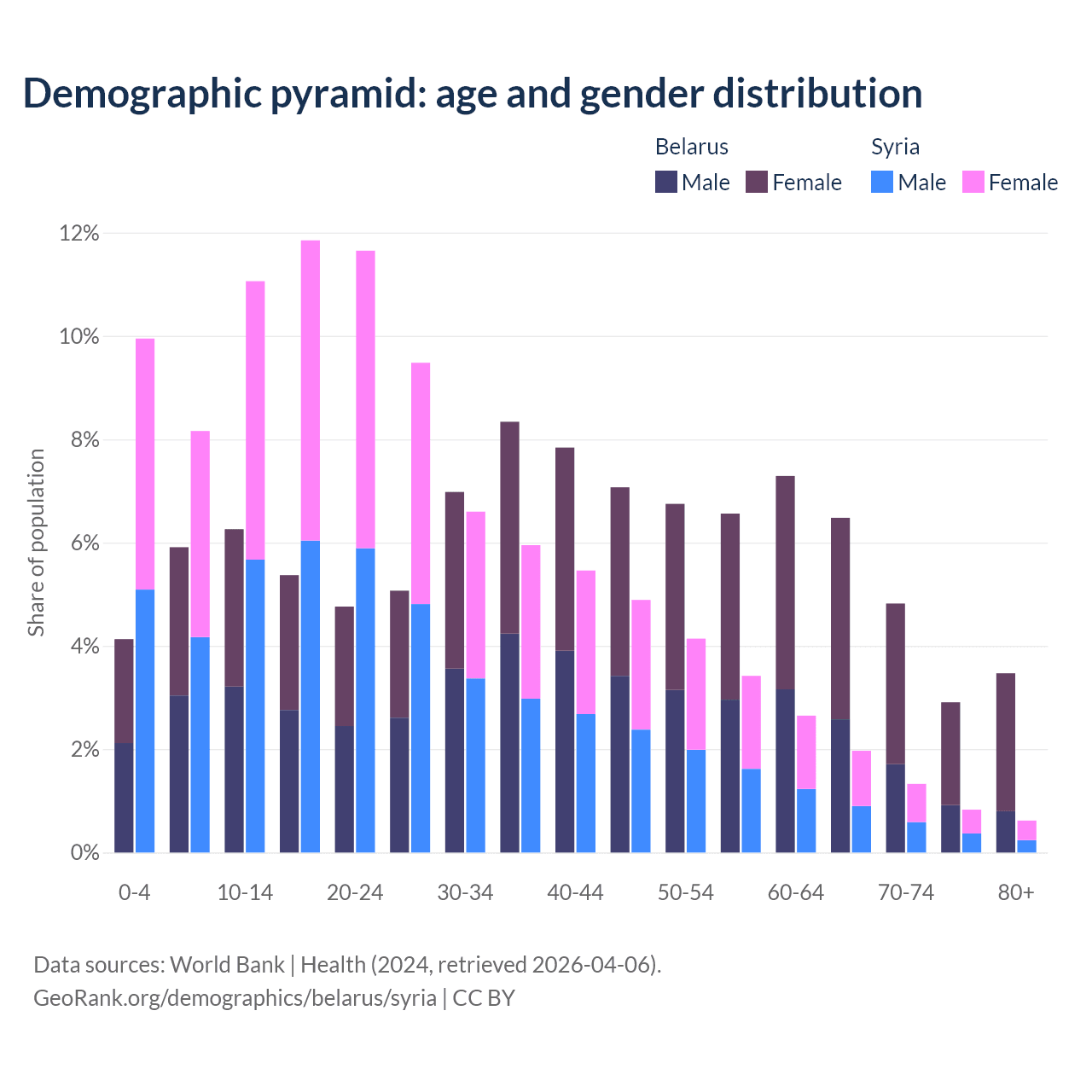 The share of older people aged 65 and over is 17.7% in Belarus and 4.74% in Syria. Life expectancy in Belarus compared to Syria .