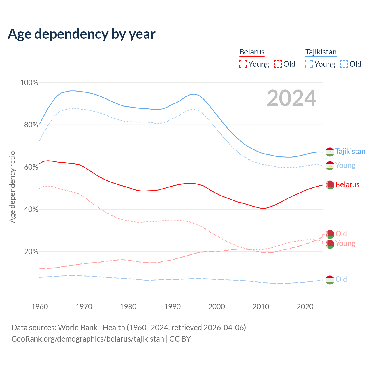 - Belarus is ranked 35/196 by median age (oldest to youngest) vs 142/196 for Tajikistan.