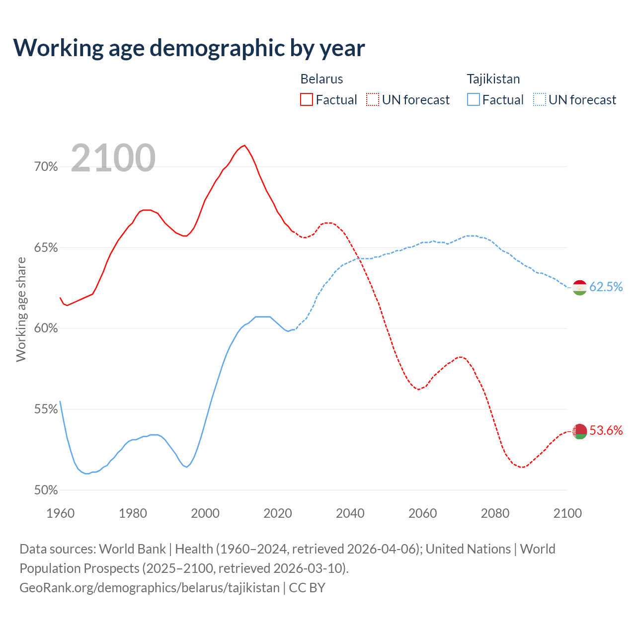 - Belarus has 5.95M working age adults (aged 15-64) vs 6.61M in Tajikistan.