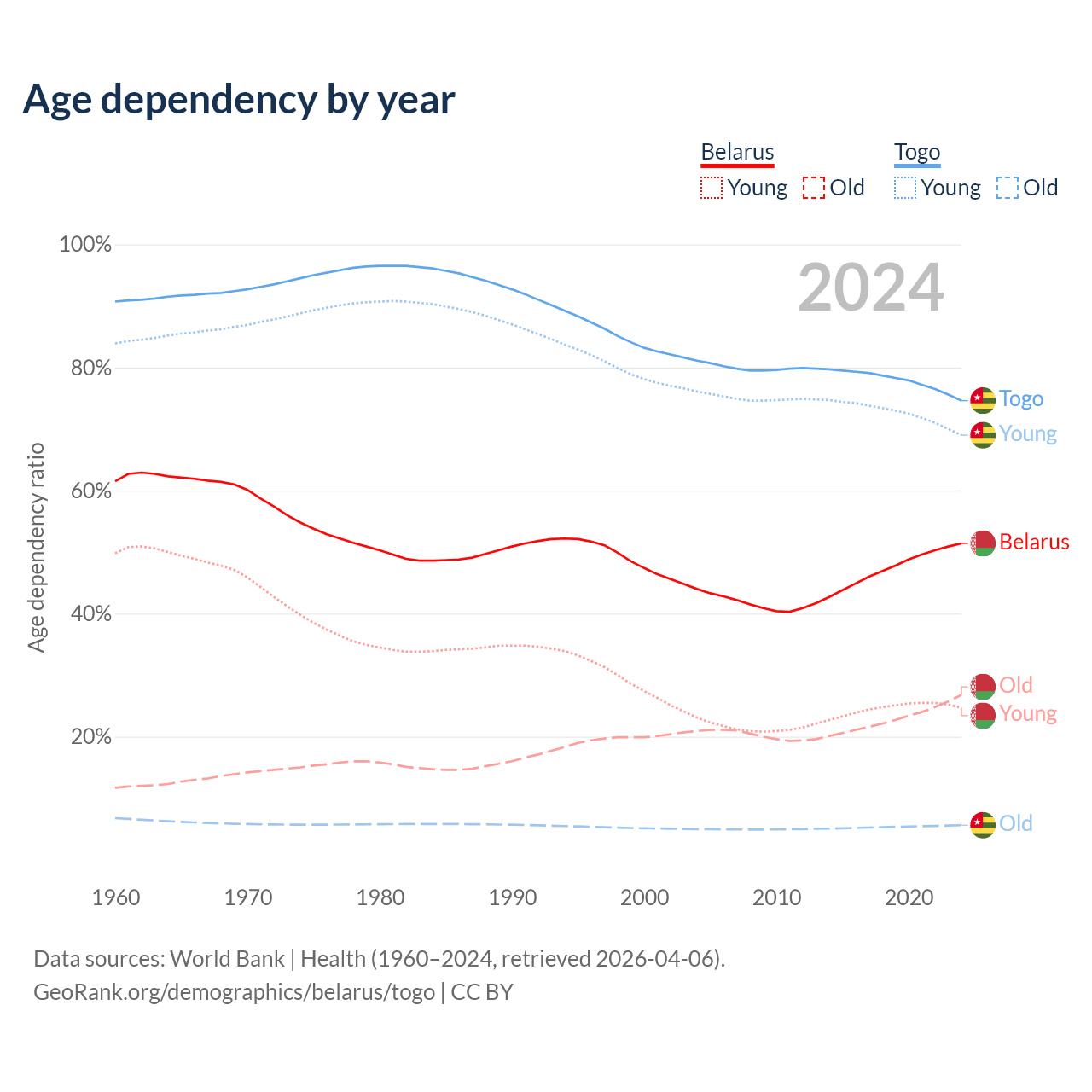 The share of older people aged 65 and over is 17.7% in Belarus and 3.21% in Togo. Life expectancy in Belarus compared to Togo .