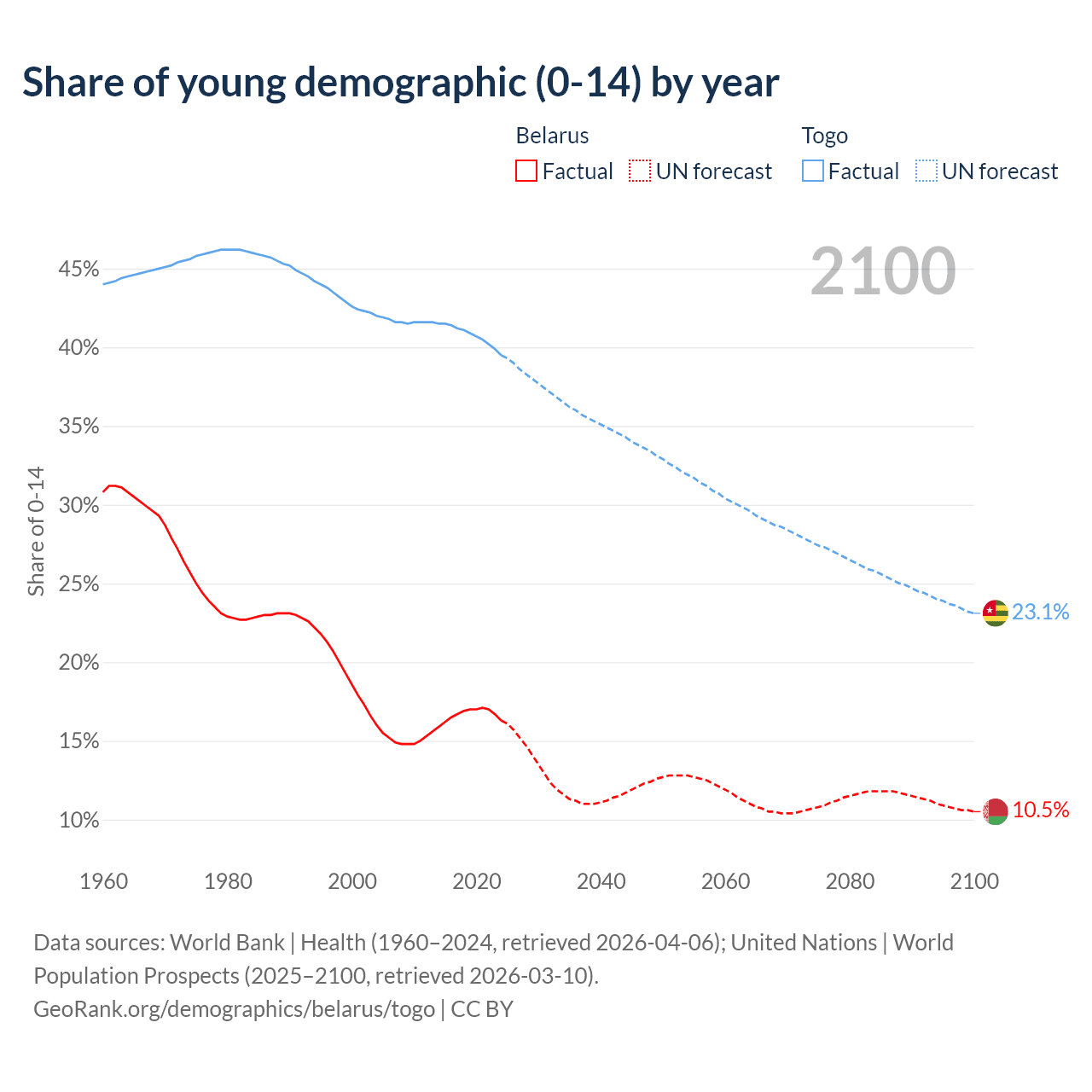 - The share of young demographic (0-15 years old) in Belarus is 16.3% vs 39.5% in Togo.
