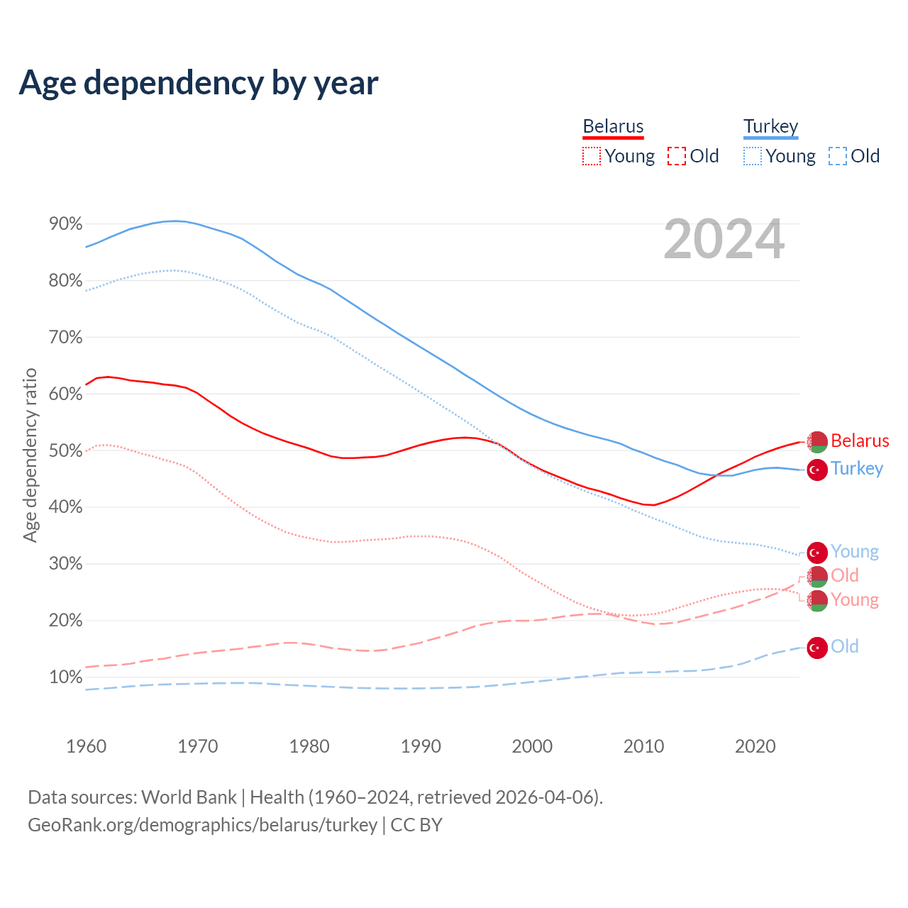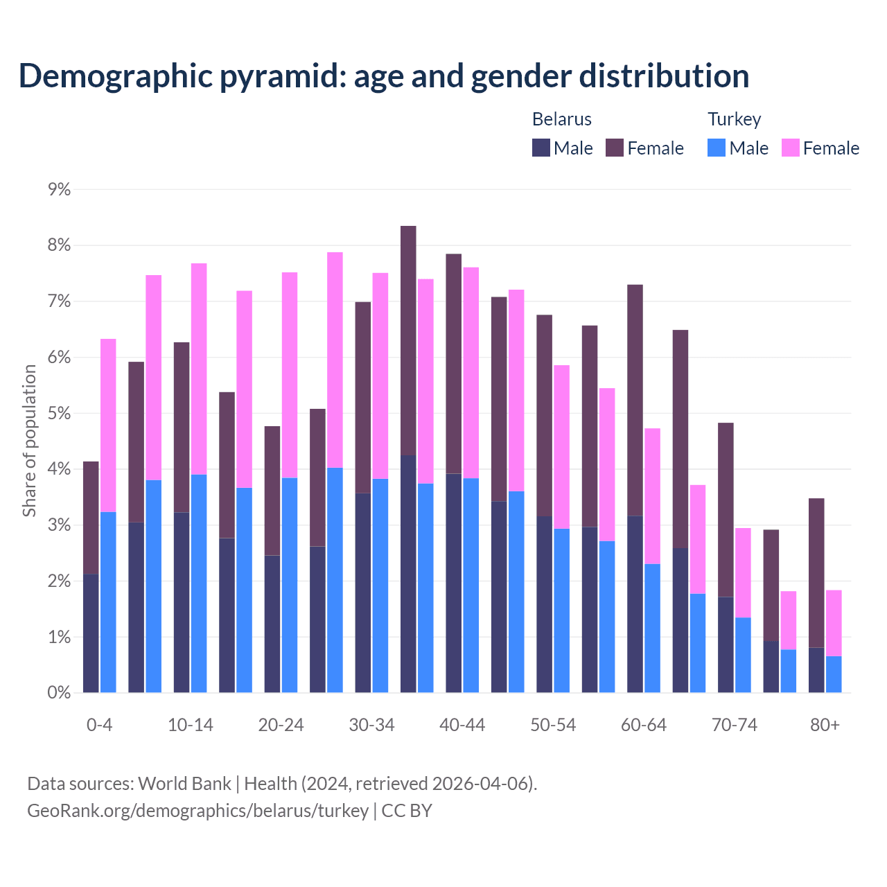 - Belarus is ranked 35/196 by median age (oldest to youngest) vs 83/196 for Turkey.