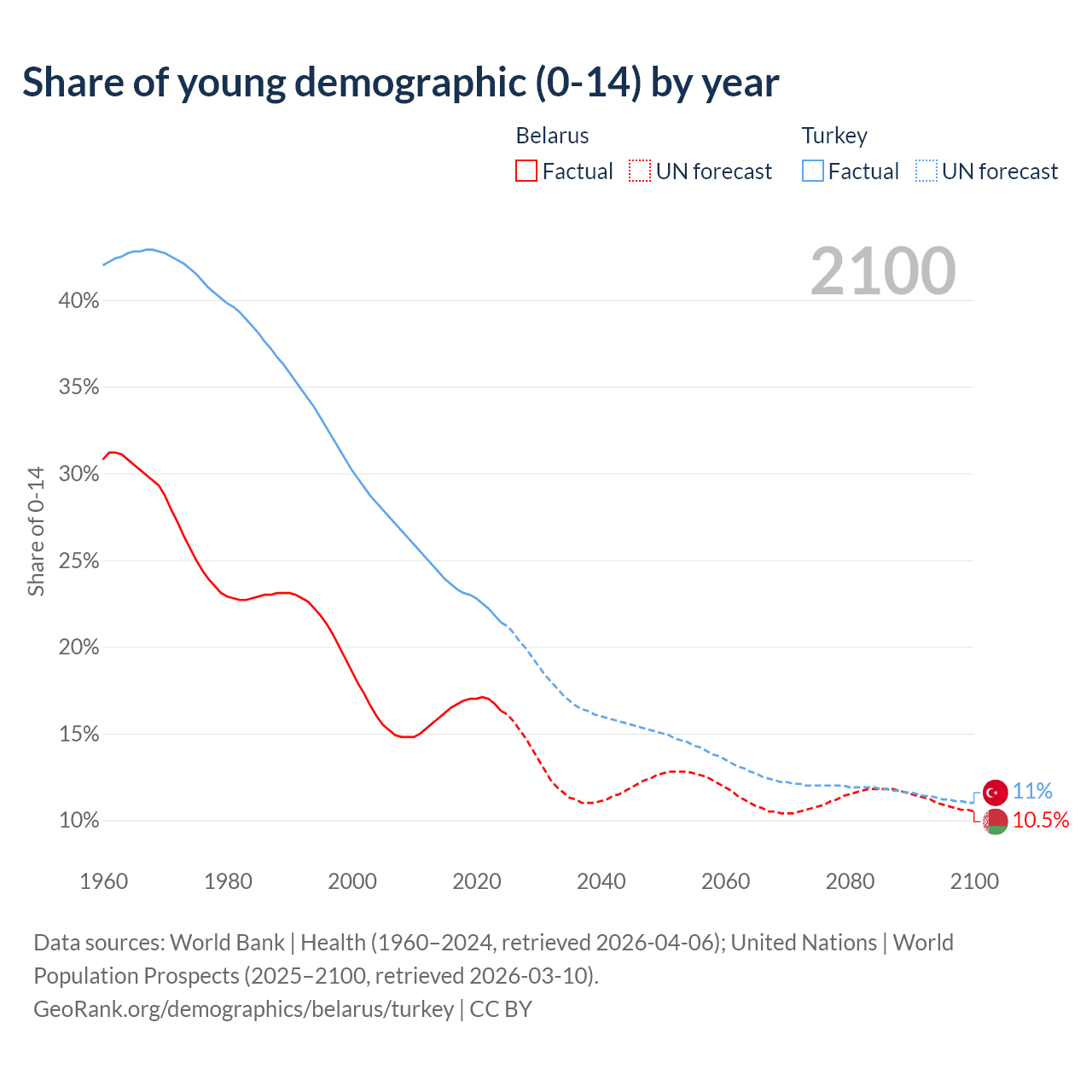 - The share of young demographic (0-15 years old) in Belarus is 16.3% vs 21.4% in Turkey.