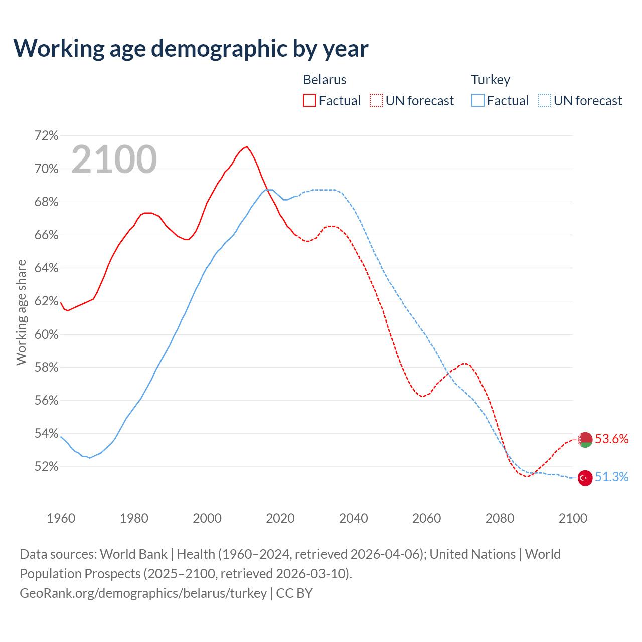 - Belarus has 5.95M working age adults (aged 15-64) vs 58.7M in Turkey.
