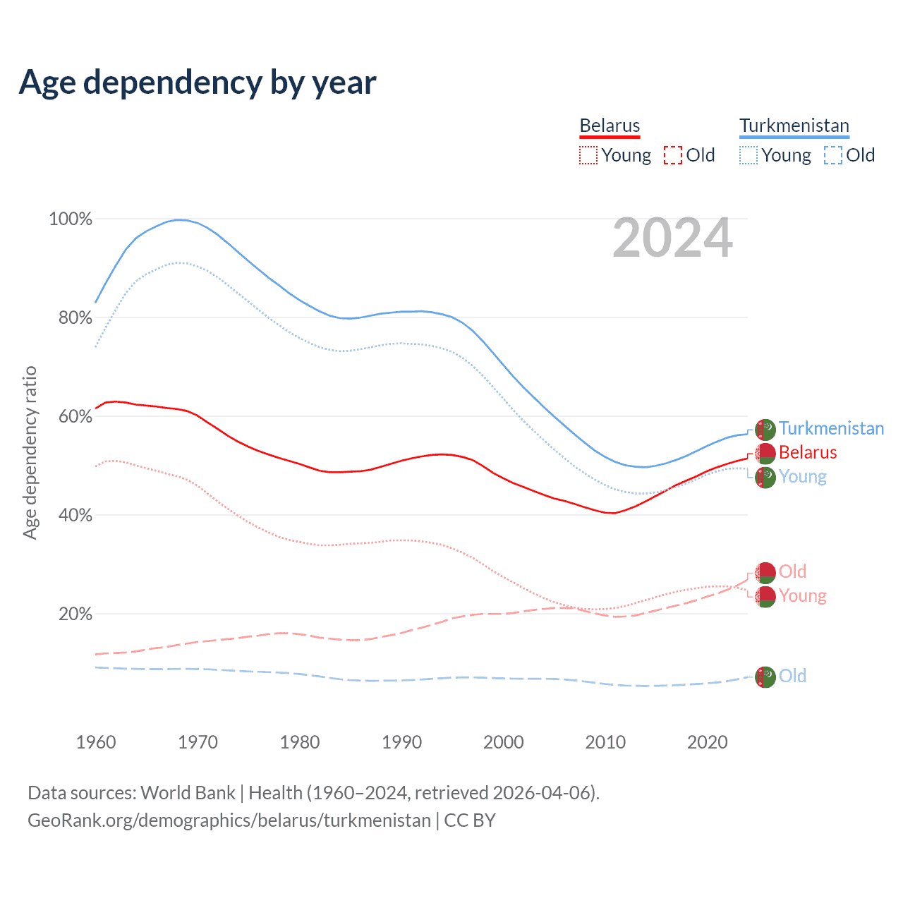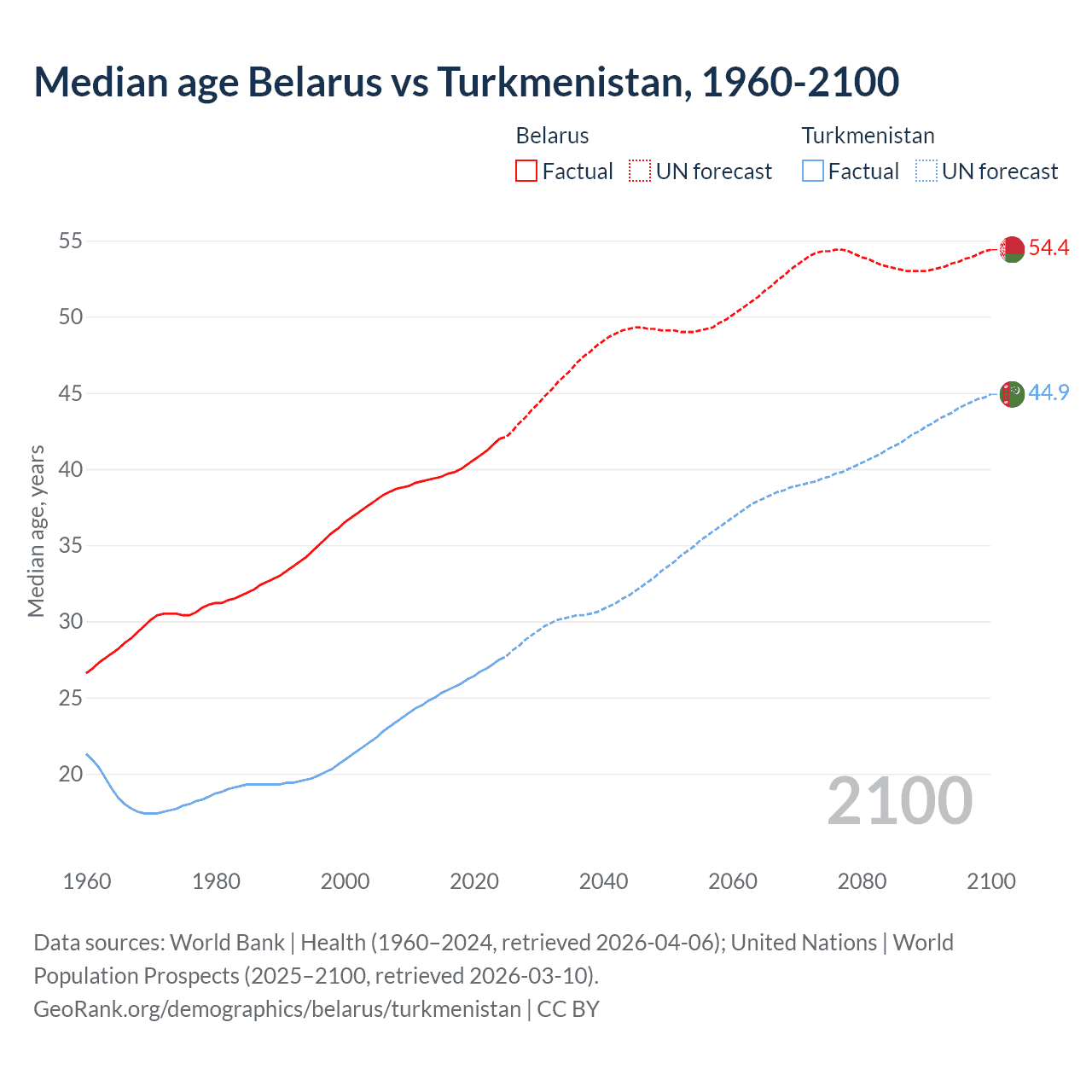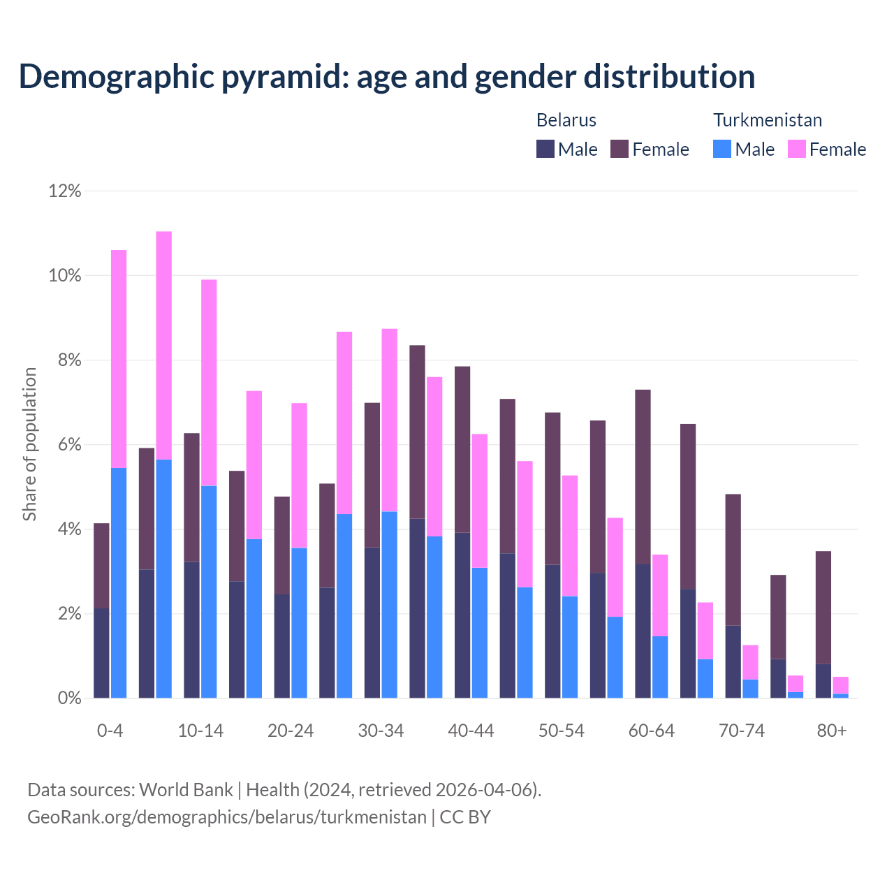 - Belarus is ranked 35/196 by median age (oldest to youngest) vs 119/196 for Turkmenistan.