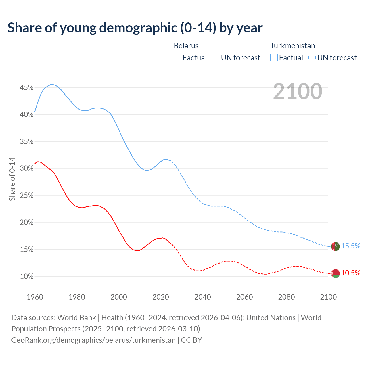 - The share of young demographic (0-15 years old) in Belarus is 16.3% vs 31.5% in Turkmenistan.