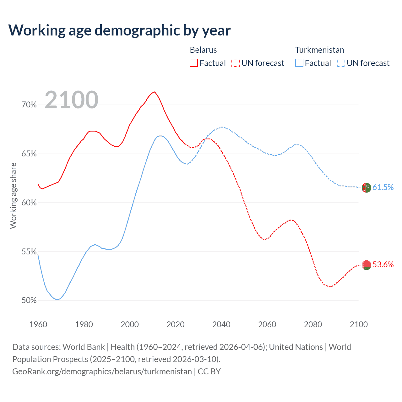 - Belarus has 5.95M working age adults (aged 15-64) vs 4.97M in Turkmenistan.