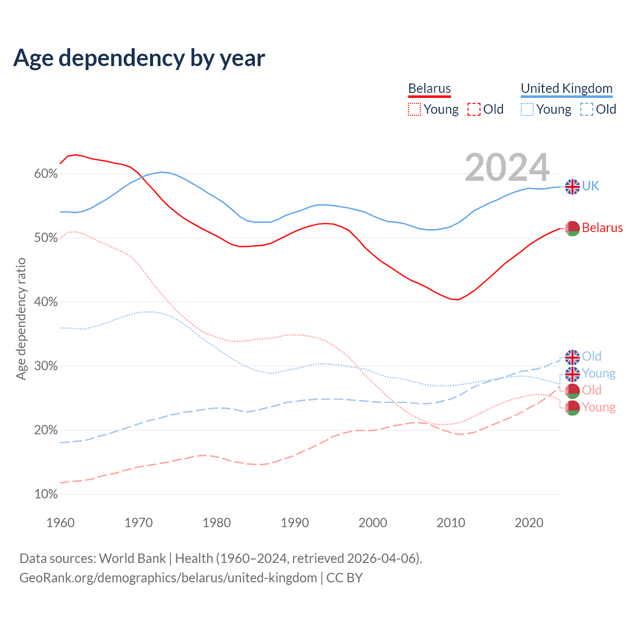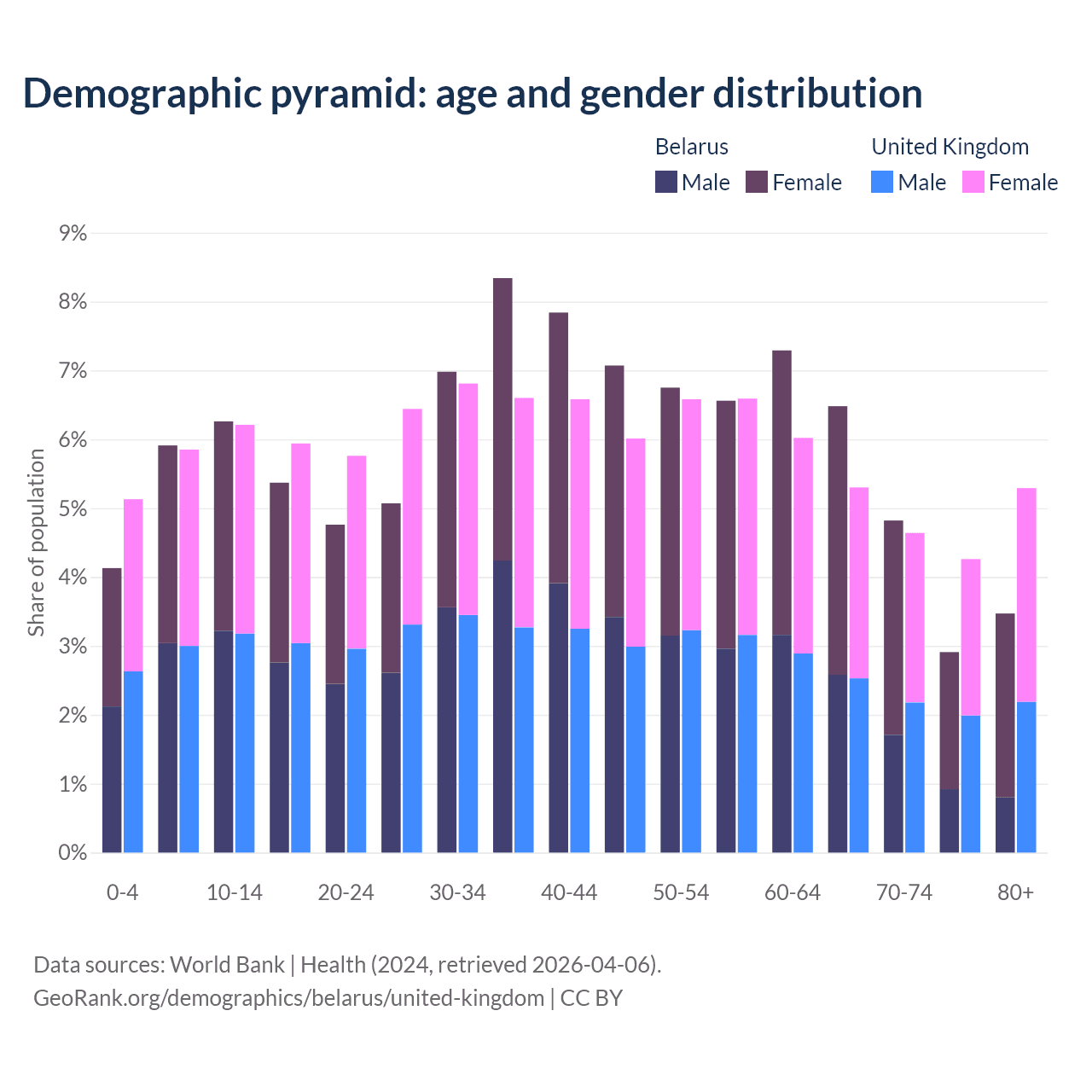 The share of older people aged 65 and over is 17.7% in Belarus and 19.5% in the United Kingdom. Life expectancy in Belarus compared to the United Kingdom .