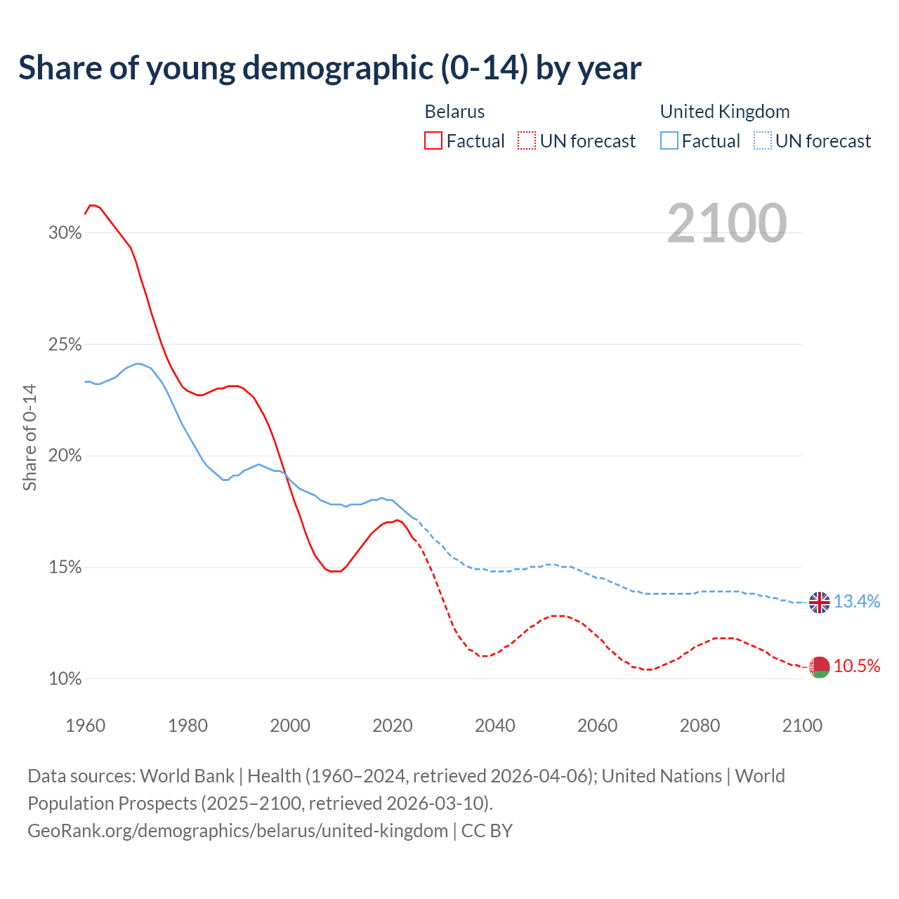 - The share of young demographic (0-15 years old) in Belarus is 16.3% vs 17.2% in the United Kingdom.