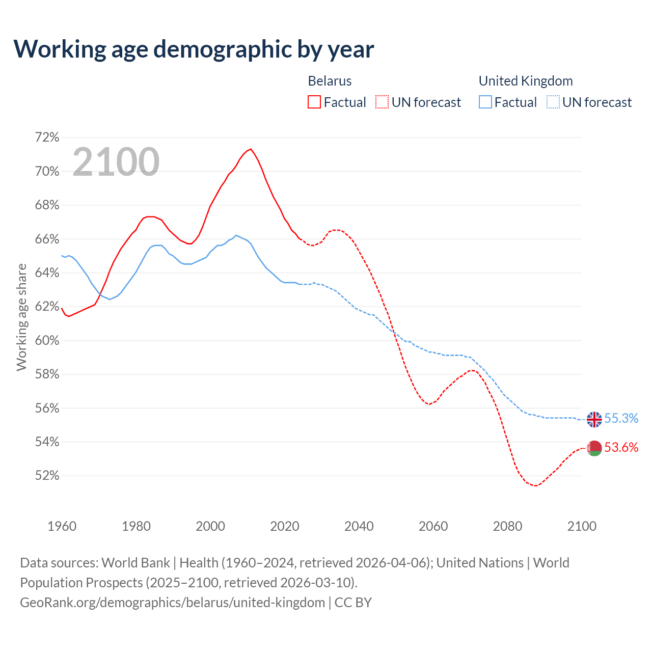 Median age Belarus vs United Kingdom, 1960-2100