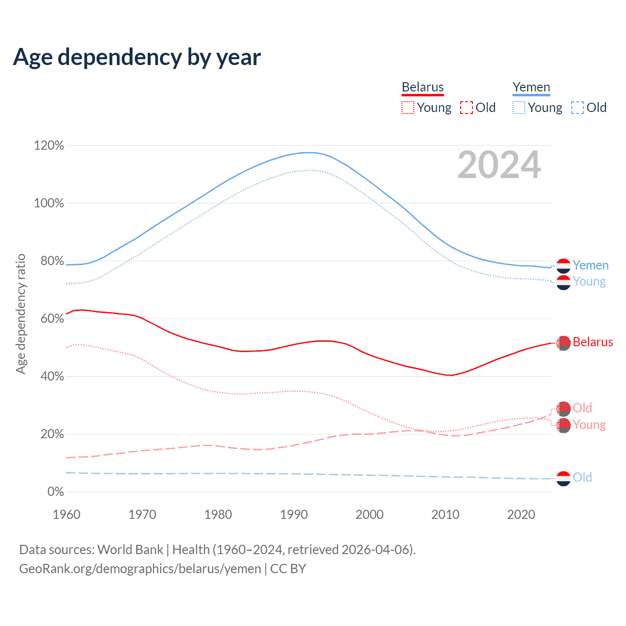 - The share of old-age demographic (65+) in Belarus is 17.7% vs 2.52% in Yemen.