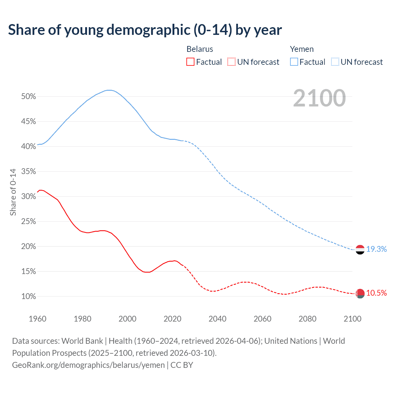 - The share of young demographic (0-15 years old) in Belarus is 16.3% vs 41.1% in Yemen.