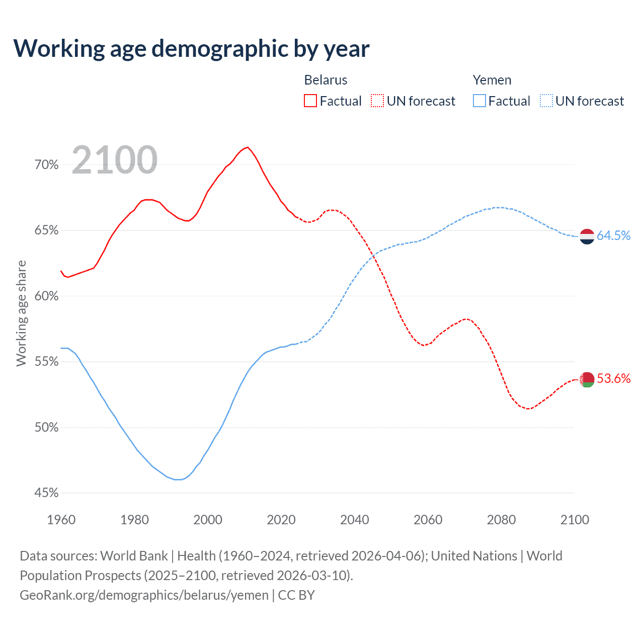 Median age Belarus vs Yemen, 1960-2100