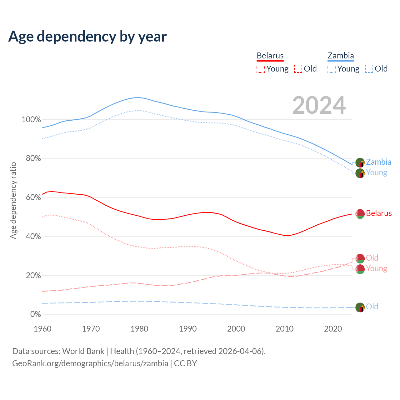 - Belarus is ranked 35/196 by median age (oldest to youngest) vs 182/196 for Zambia.