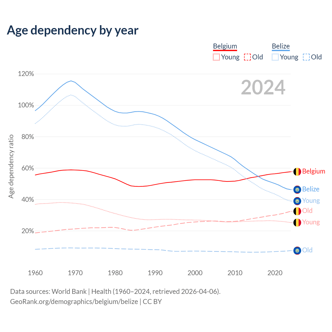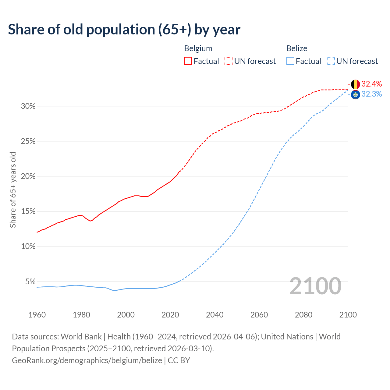 - The share of old-age demographic (65+) in Belgium is 20.6% vs 5.02% in Belize.