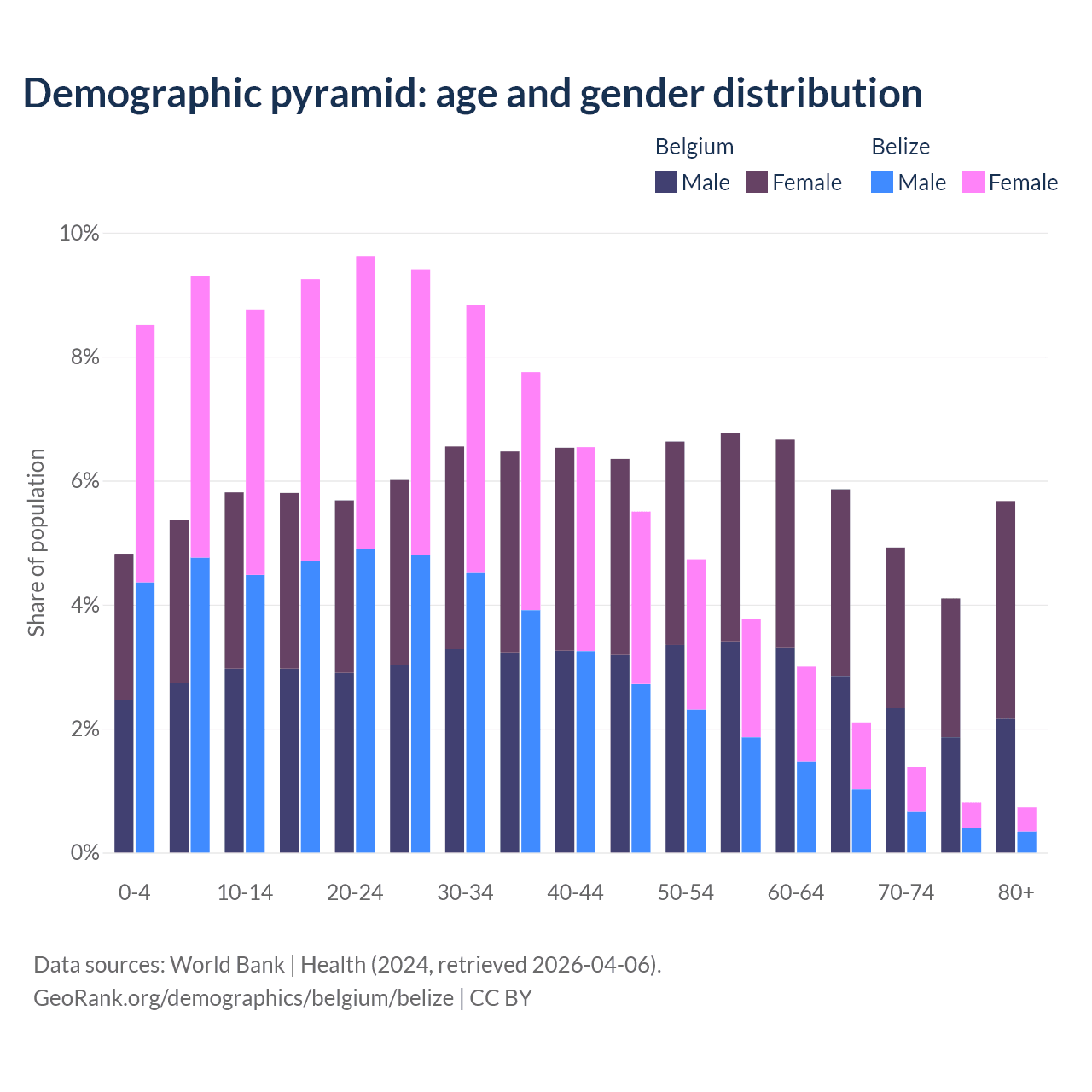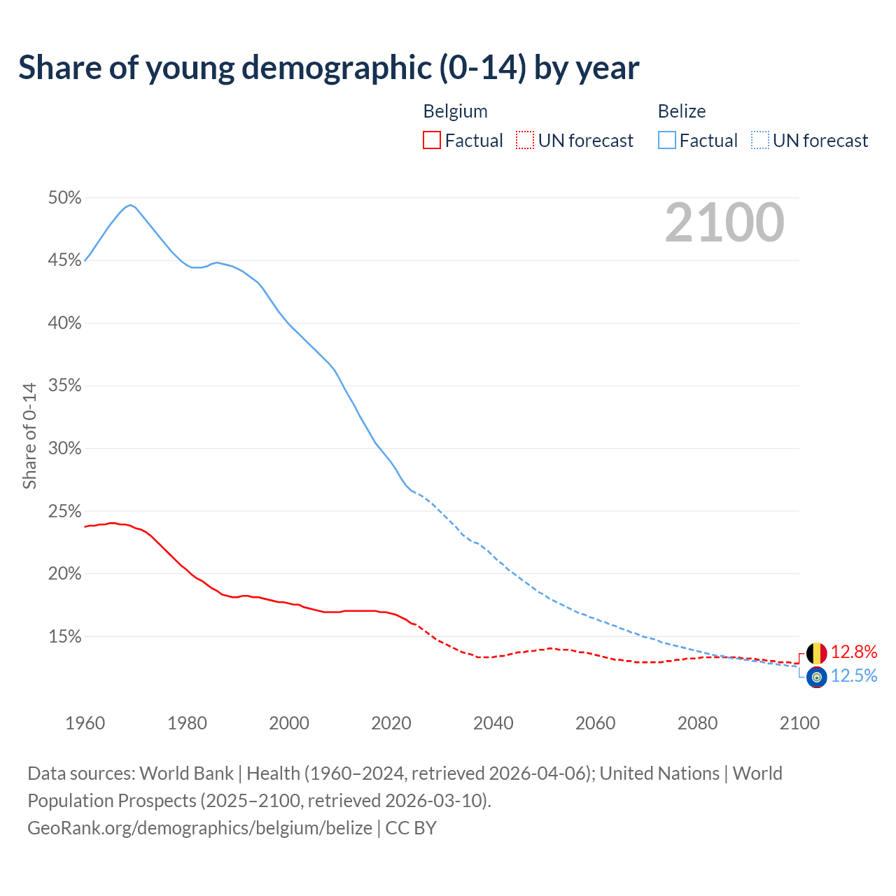 - The share of young demographic (0-15 years old) in Belgium is 16% vs 26.6% in Belize.