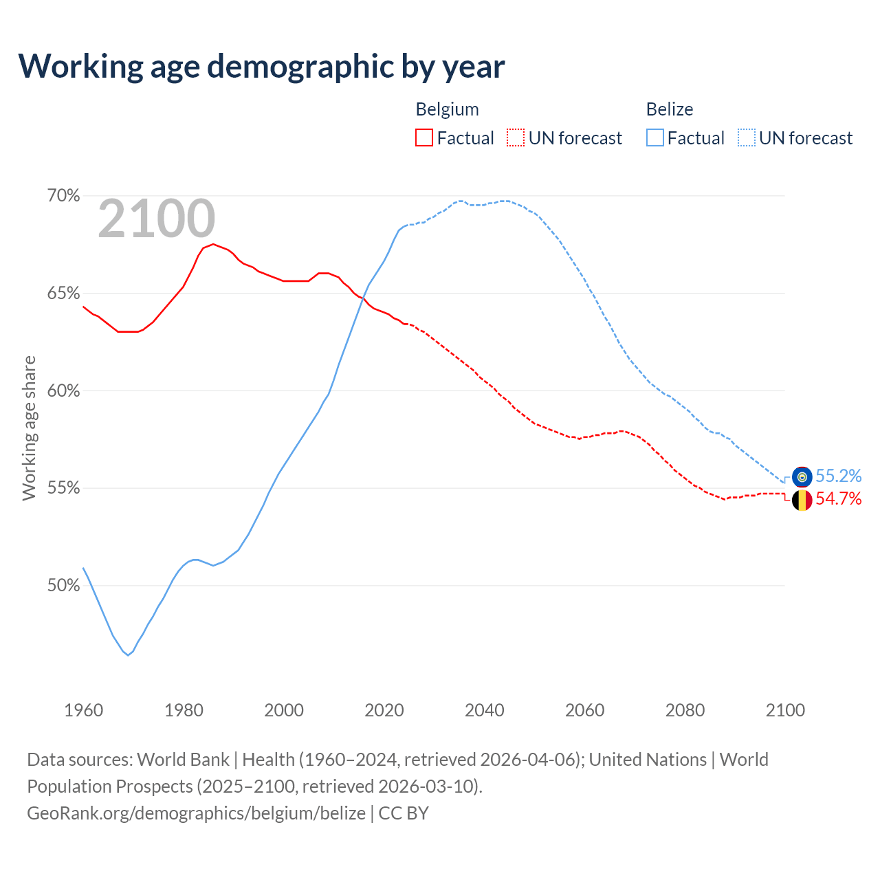 Median age Belgium vs Belize, 1960-2100