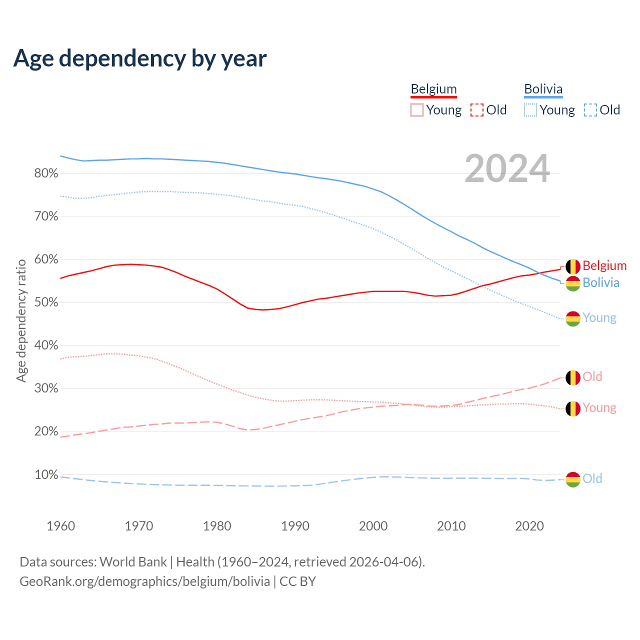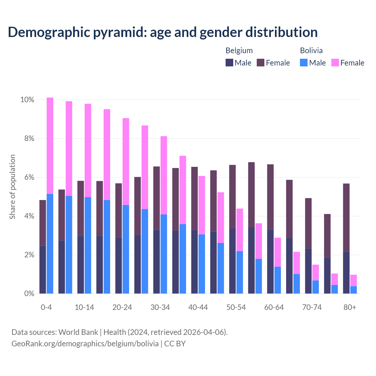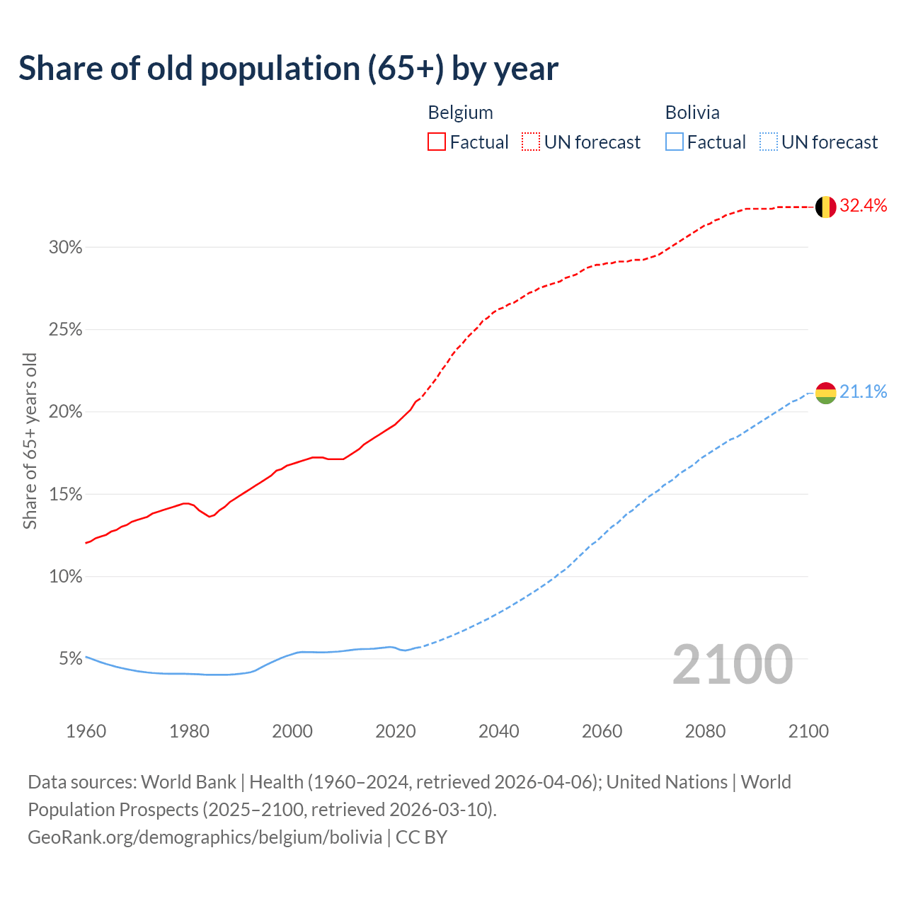 - The share of old-age demographic (65+) in Belgium is 20.6% vs 5.64% in Bolivia.