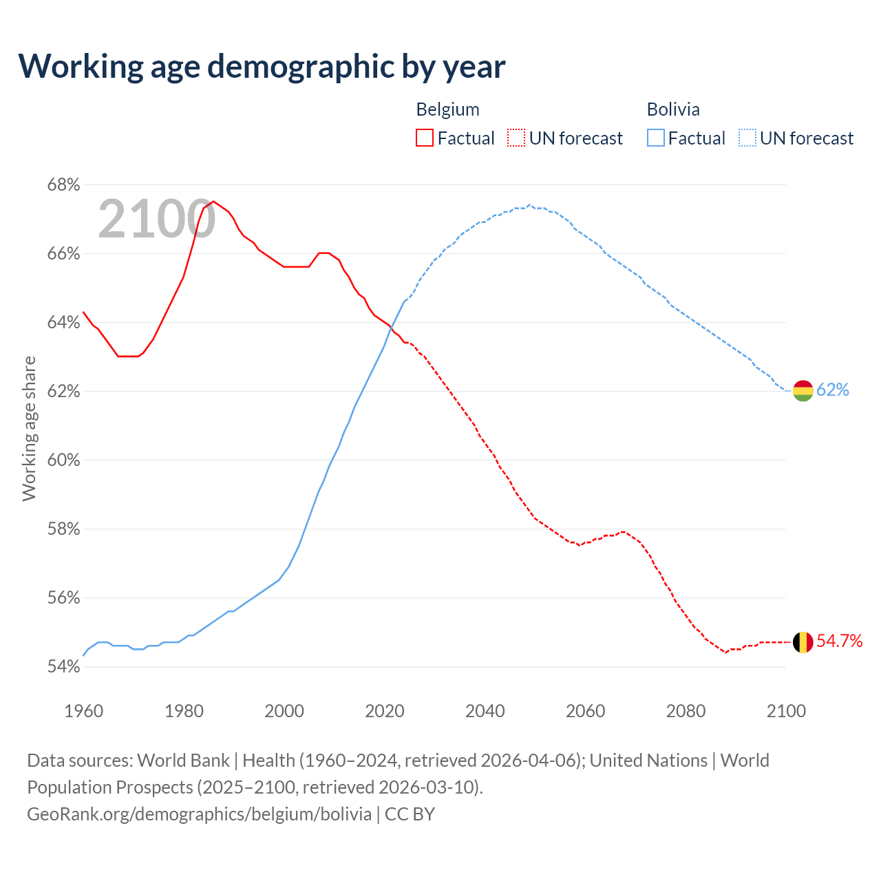 Median age Belgium vs Bolivia, 1960-2100