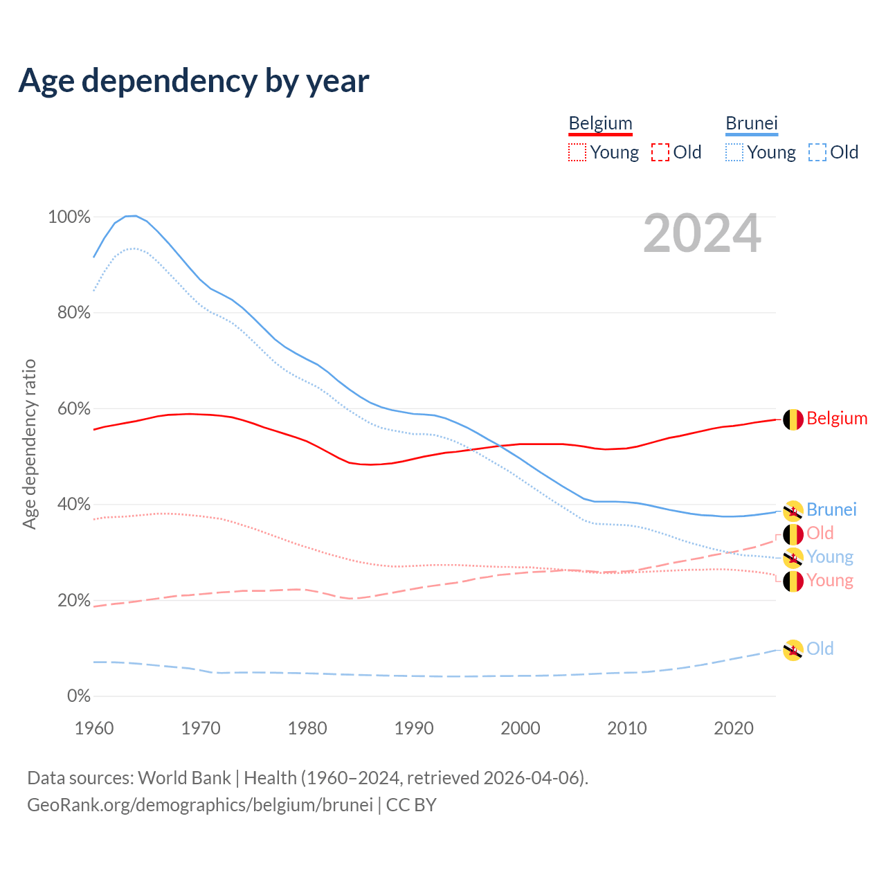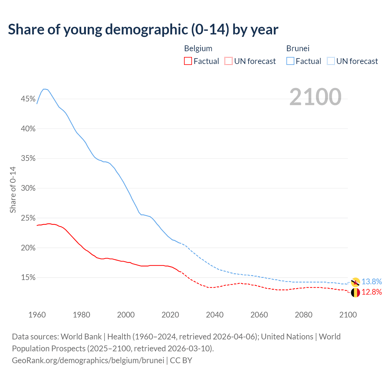 - The share of young demographic (0-15 years old) in Belgium is 16% vs 20.8% in Brunei.