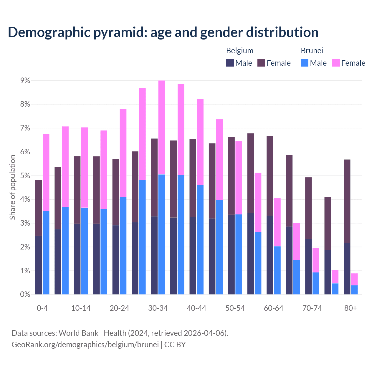 - Belgium is ranked 32/196 by median age (oldest to youngest) vs 88/196 for Brunei.