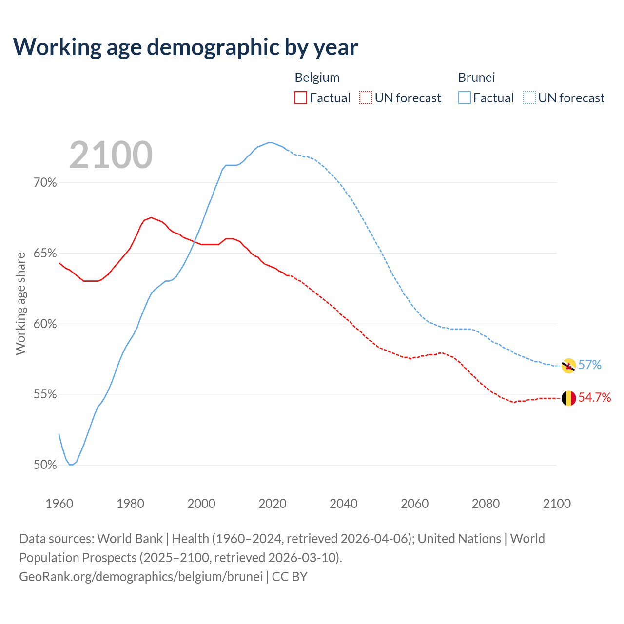 Median age Belgium vs Brunei, 1960-2100