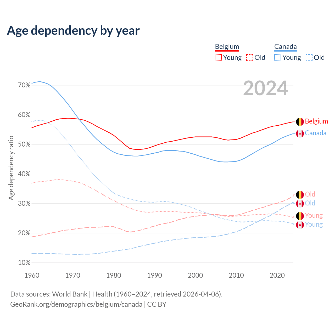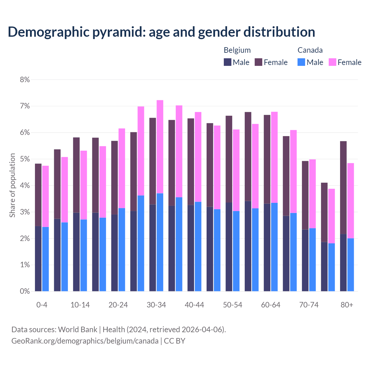 - Belgium is ranked 32/196 by median age (oldest to youngest) vs 38/196 for Canada.
