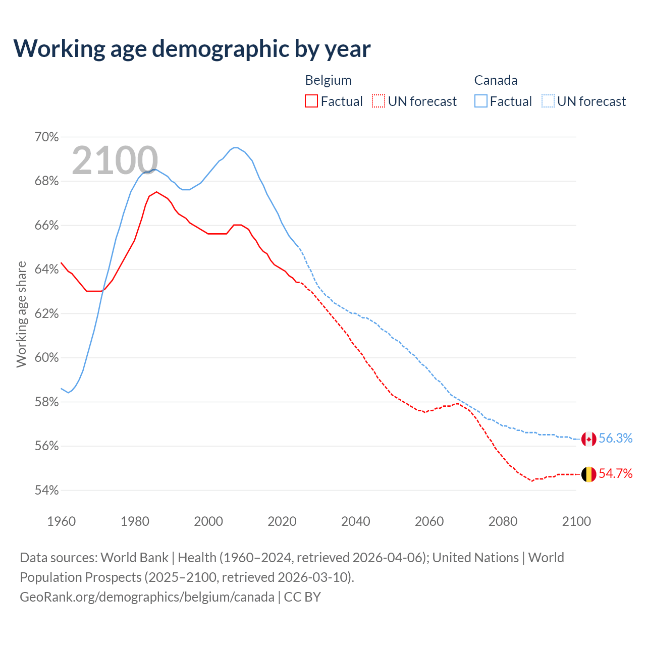 - Belgium has 7.55M working age adults (aged 15-64) vs 27.5M in Canada.