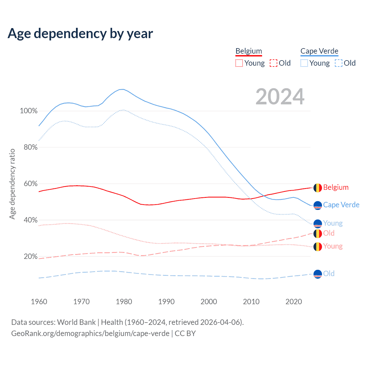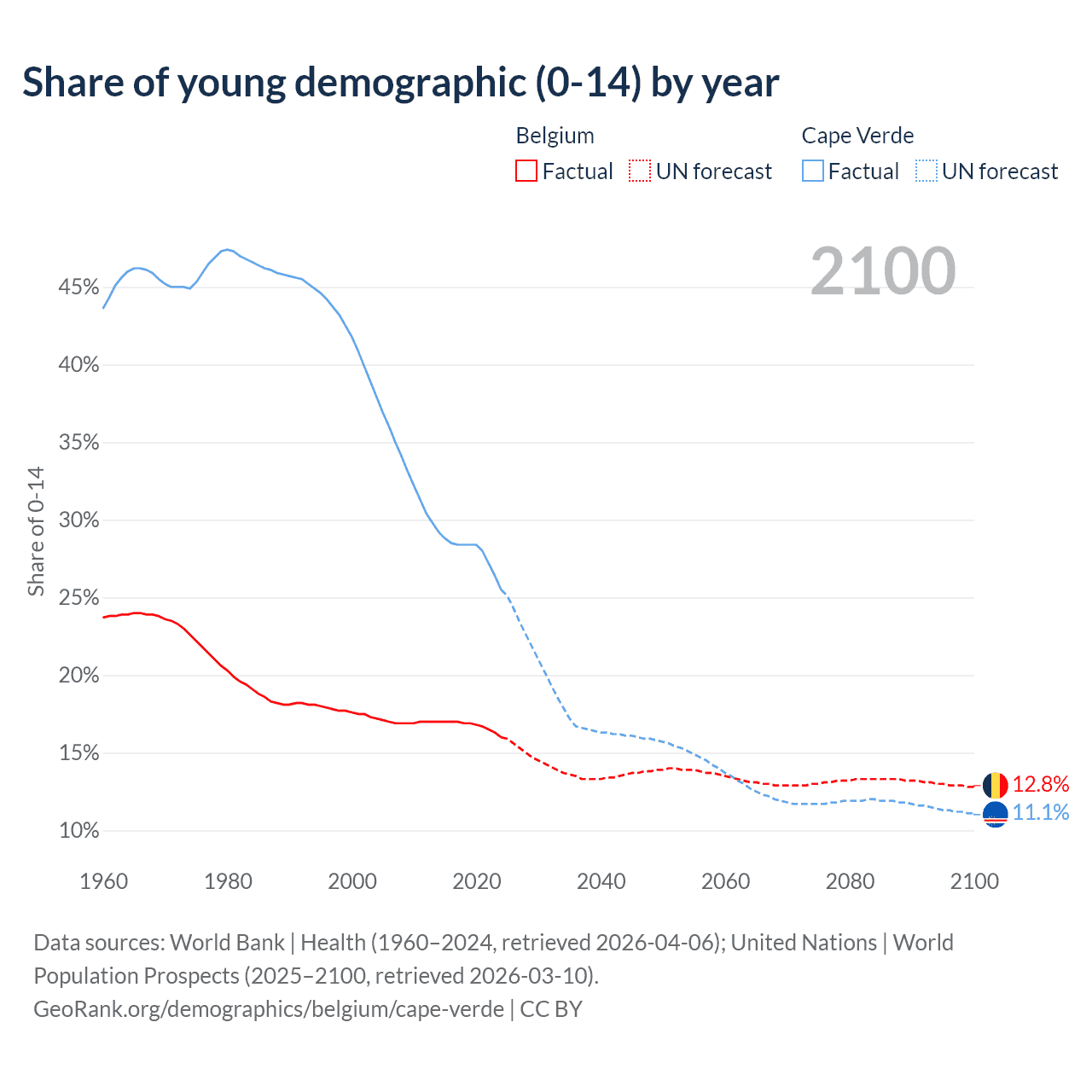 - The share of young demographic (0-15 years old) in Belgium is 16% vs 25.5% in Cape Verde.