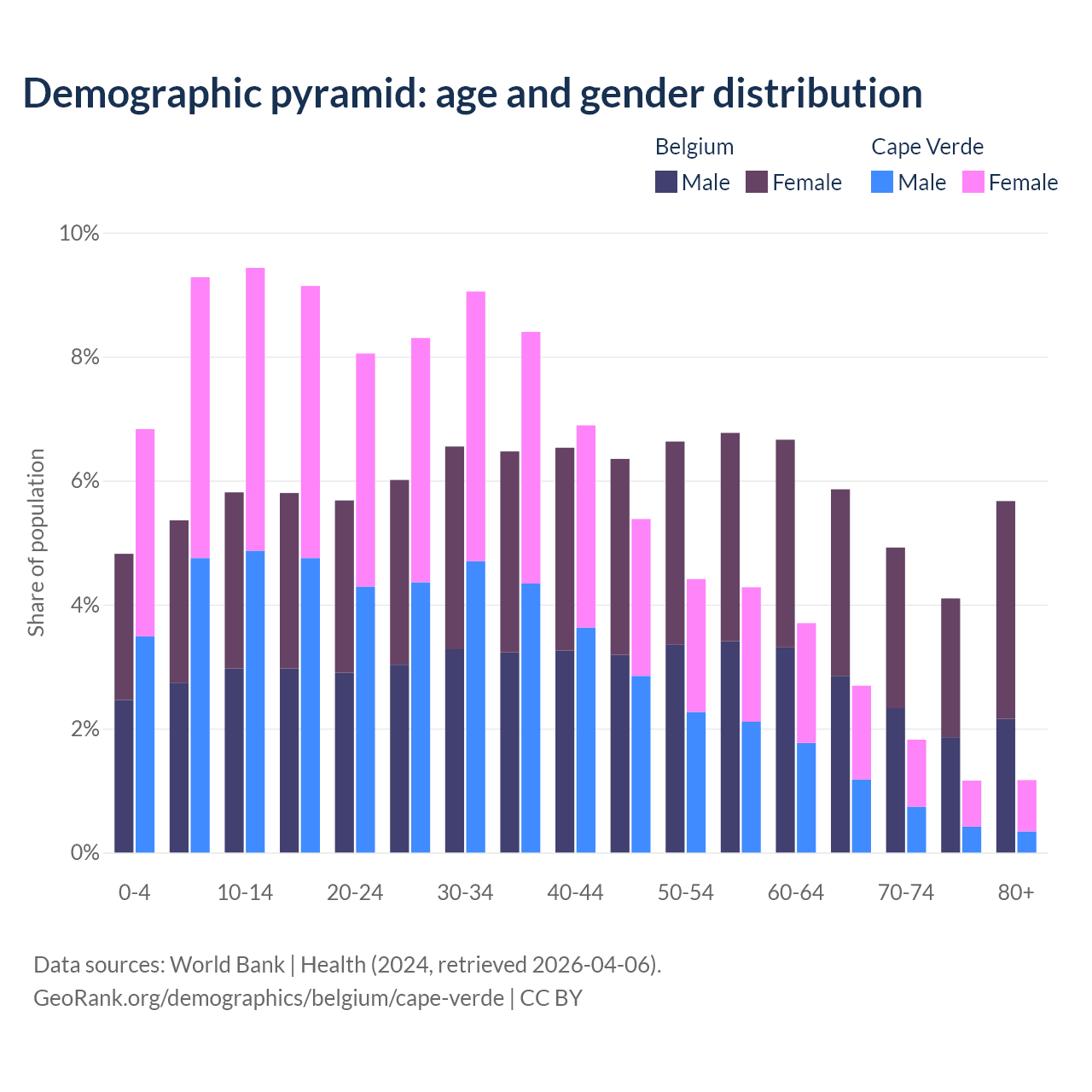 - The share of old-age demographic (65+) in Belgium is 20.6% vs 6.86% in Cape Verde.