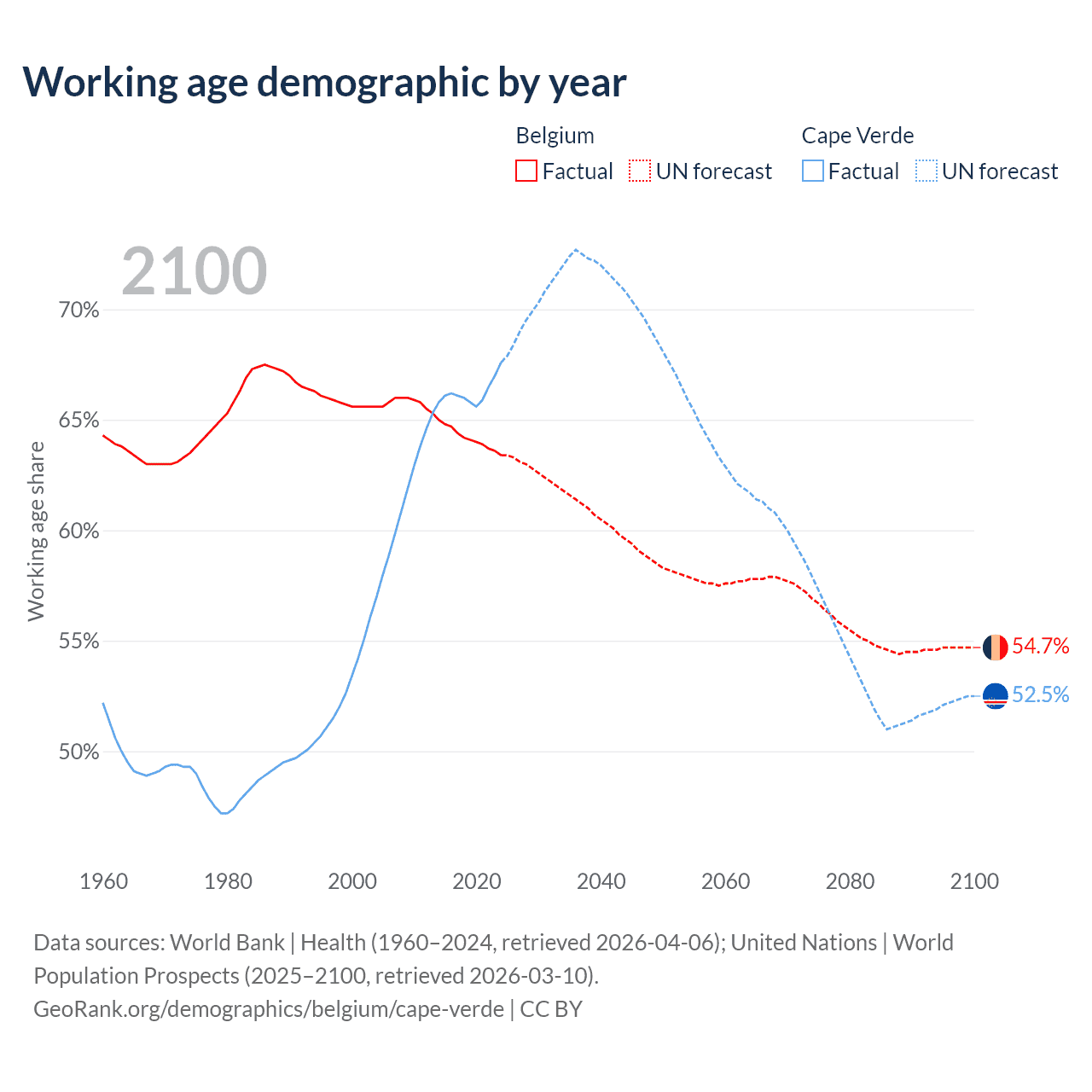 Median age Belgium vs Cape Verde, 1960-2100