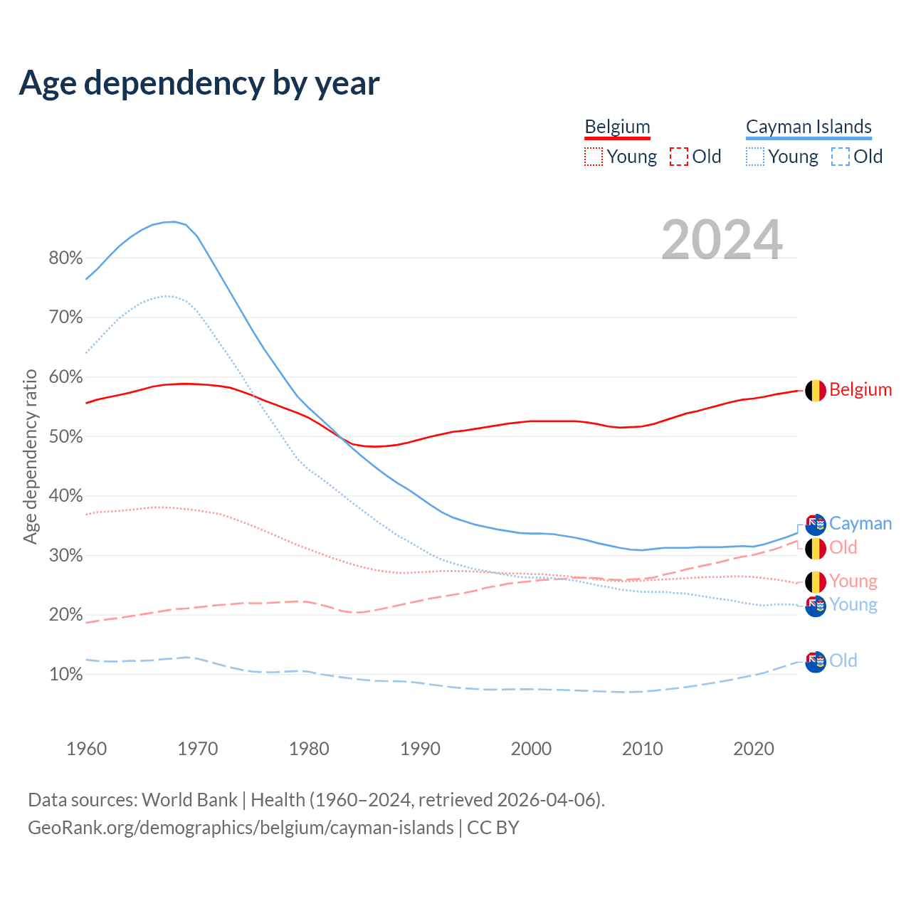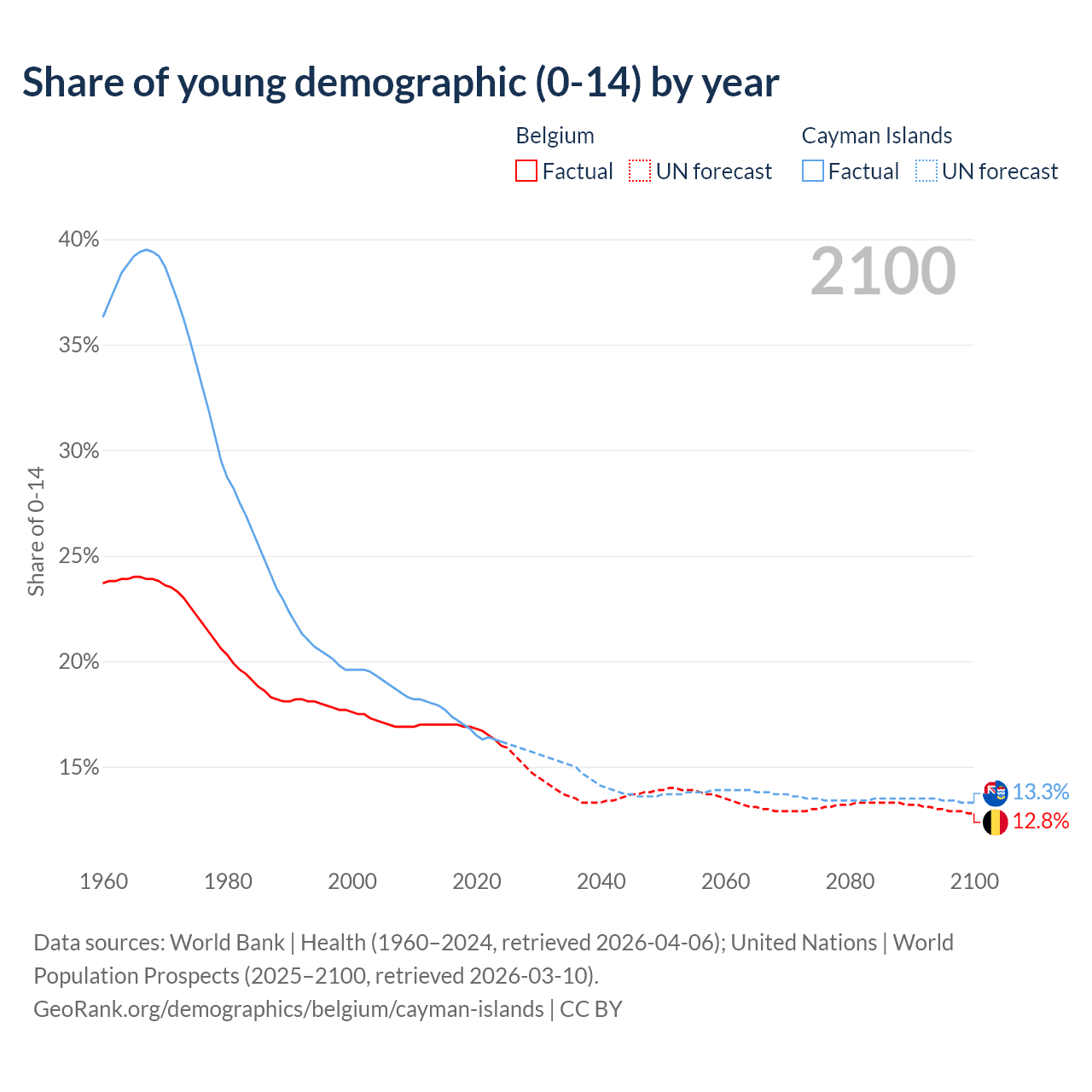 - The share of young demographic (0-15 years old) in Belgium is 16% vs 16.2% in the Cayman Islands.