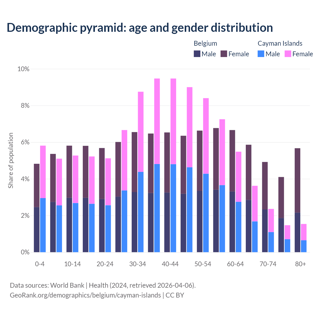 - Belgium is ranked 32/196 by median age (oldest to youngest) vs 51/196 for the Cayman Islands.