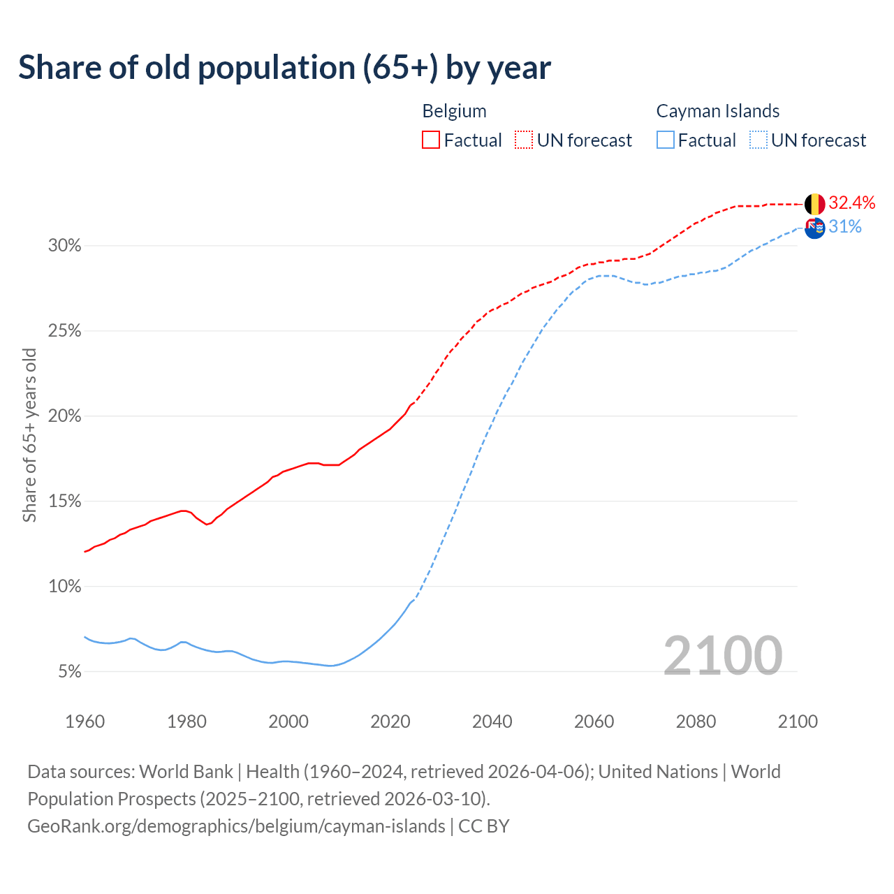 The share of older people aged 65 and over is 20.6% in Belgium and 9% in the Cayman Islands. Life expectancy in Belgium compared to the Cayman Islands .